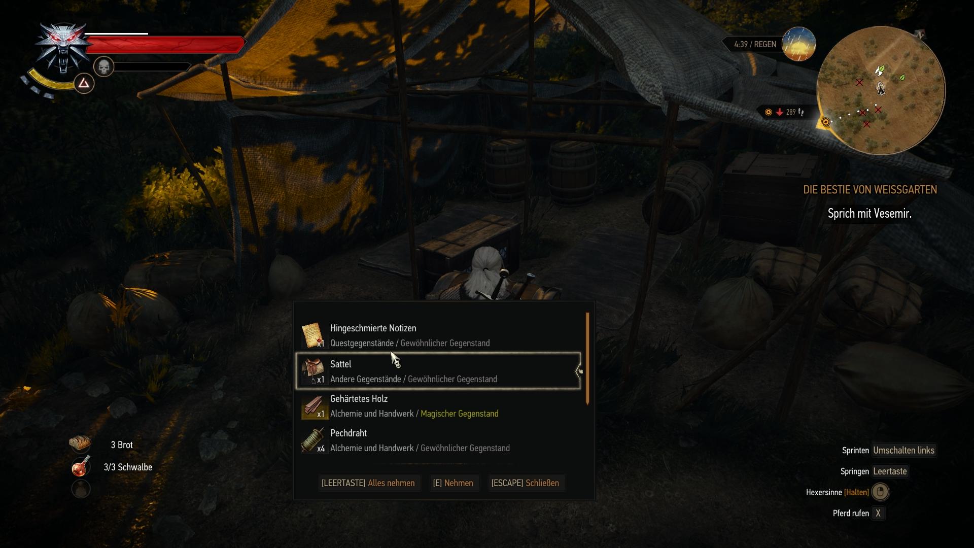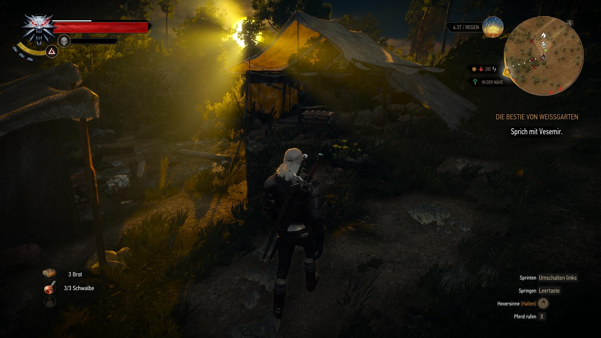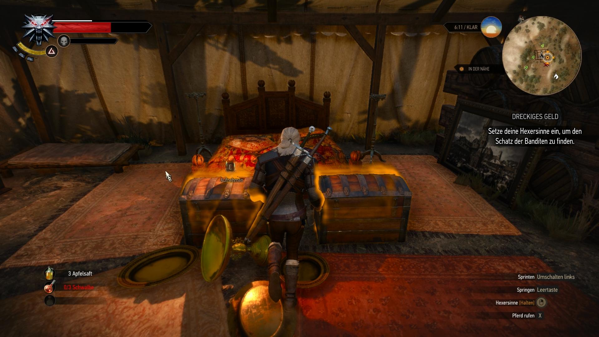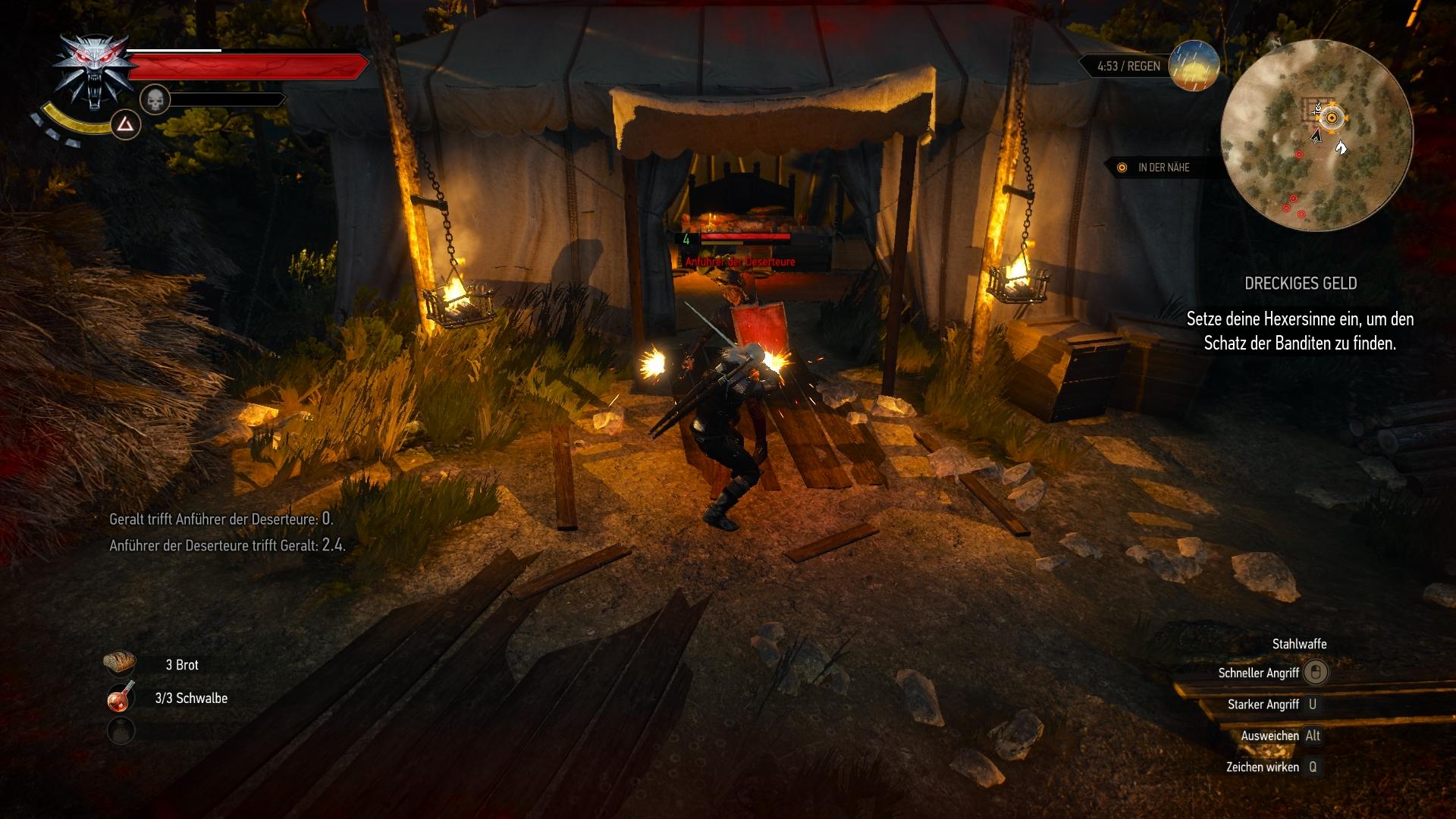 Weit im Nordosten des Weißgarten Bezirkes gibt es zahlreiche Lager von temerischen Deserteuren. Das Banditenlager [17], was der Mühle am nächsten liegt, birgt eine Truhe in sich, worin wiederum die "Hingeschmierten Notizen" schlummern. Die Aufnahme der Notizen starten die "Dreckiges Geld" Schatzsuche und das Lesen führt euch zum Standort des zweiten Lagers [18]. Der Anführer in diesem Lager ist mit einem Schild gerüstet und kann eine kämpferische Herausforderung darstellen. Versucht mit Blocken hinter ihn zu kommen und dann zu Boden zu werfen oder anzuzünden, um mehrere Treffer landen zu können. Sobald ihr ihn bezwungen habt, dürft ihr die drei Truhen in dem großen Zelt plündern. Das schließt die Schatzsuche ab. Falls ihr dieses Lager [18] vor dem ersten [17] gefunden habt, wird die Quest nicht mehr durch die "Hingeschmierte Notizen" gestartet.