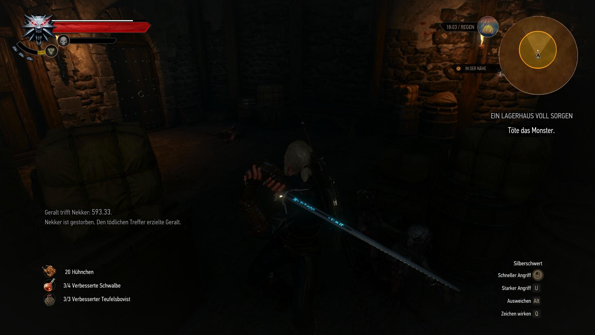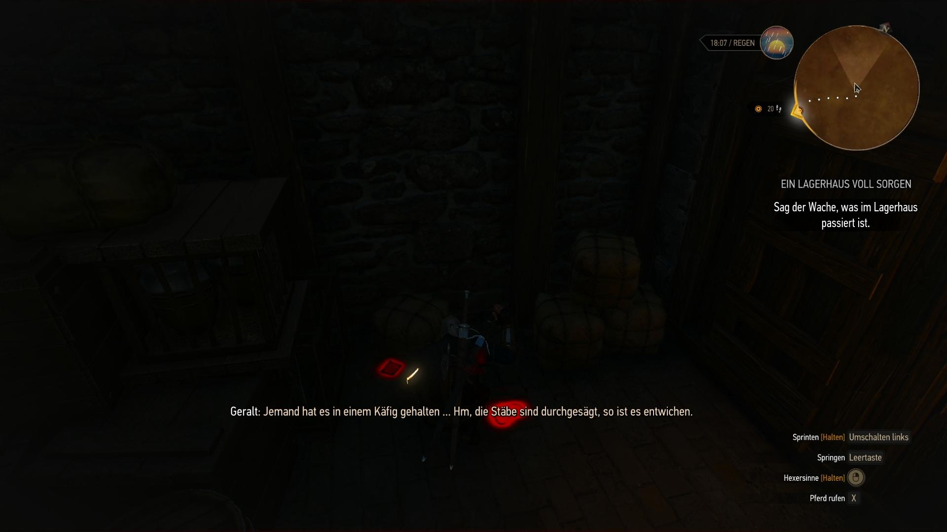 Am südwestlichsten Rand von Novigrad, hinter den Lagerhäusern des Hafens, gibt es diese ungekennzeichnete Quest [22]. Das es sich um einen Auftrag für einen Hexer handelt, stellt ihr erst fest, wenn ihr die Wache ansprecht. Der Mensch und der Zwerg, welche die drei Wachen festhalten, beschuldigen sich gegenseitig. Fakt ist aber, dass ein Monster im Lagerhaus ist und Geralt angeboten wird, es für 60 Kronen zu vertreiben. Nehmt den Auftrag an und geht die Treppe, direkt neben der Auftragerteilenden Wache hoch ins Lagerhaus. Drinnen werdet ihr von einem vereinzelten Nekker (Stufe 13) angegriffen. Was sehr verwunderlich ist, da Nekker für gewöhnlich nur in Gruppen auftreten. Untersucht das Lagerhaus genauer. In der Ecke hinten links (Nordwesten) findet ihr zwei Hinweise. Ein Käfig mit angesägten Stäben und der Fußabdruck eines Zwergs. Womit der Täter wohl feststehen dürfte. Ihr könnt euch dennoch entschließen den Menschen einsperren zu lassen oder beide. Die Belohnung ist die selbe: