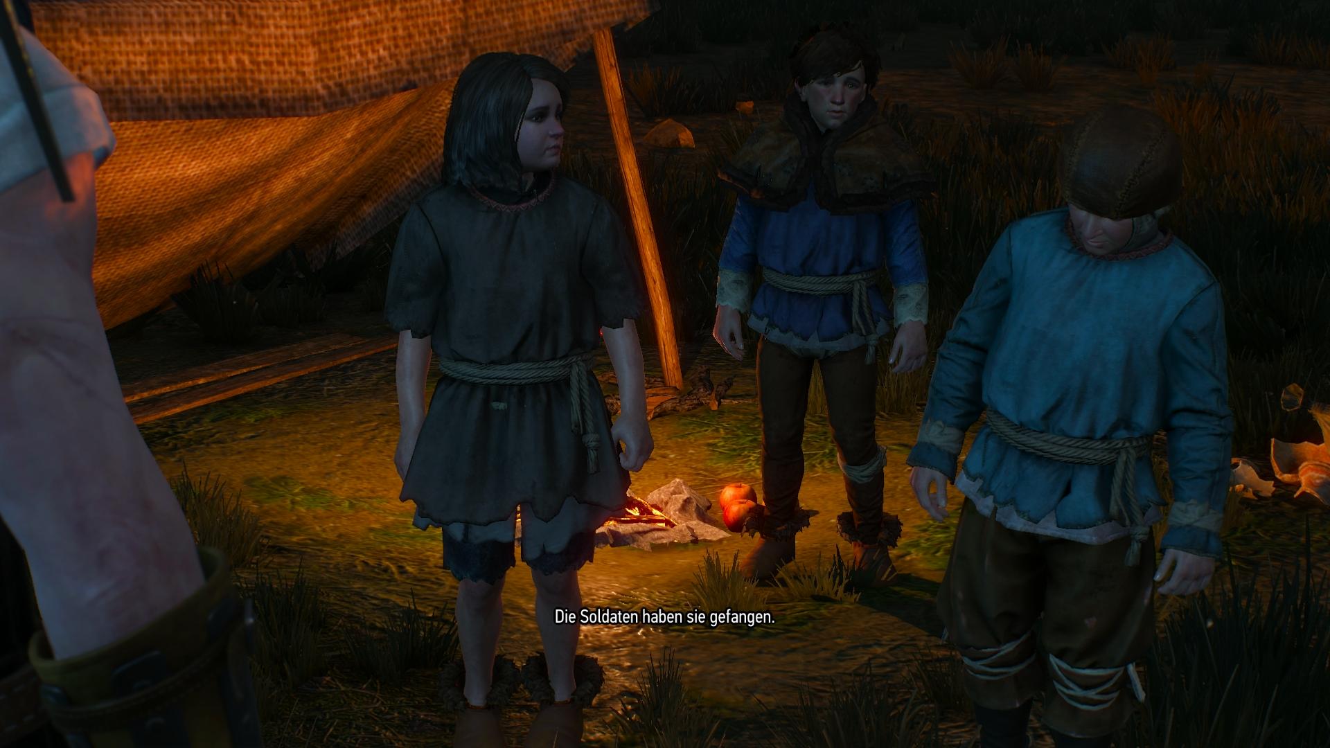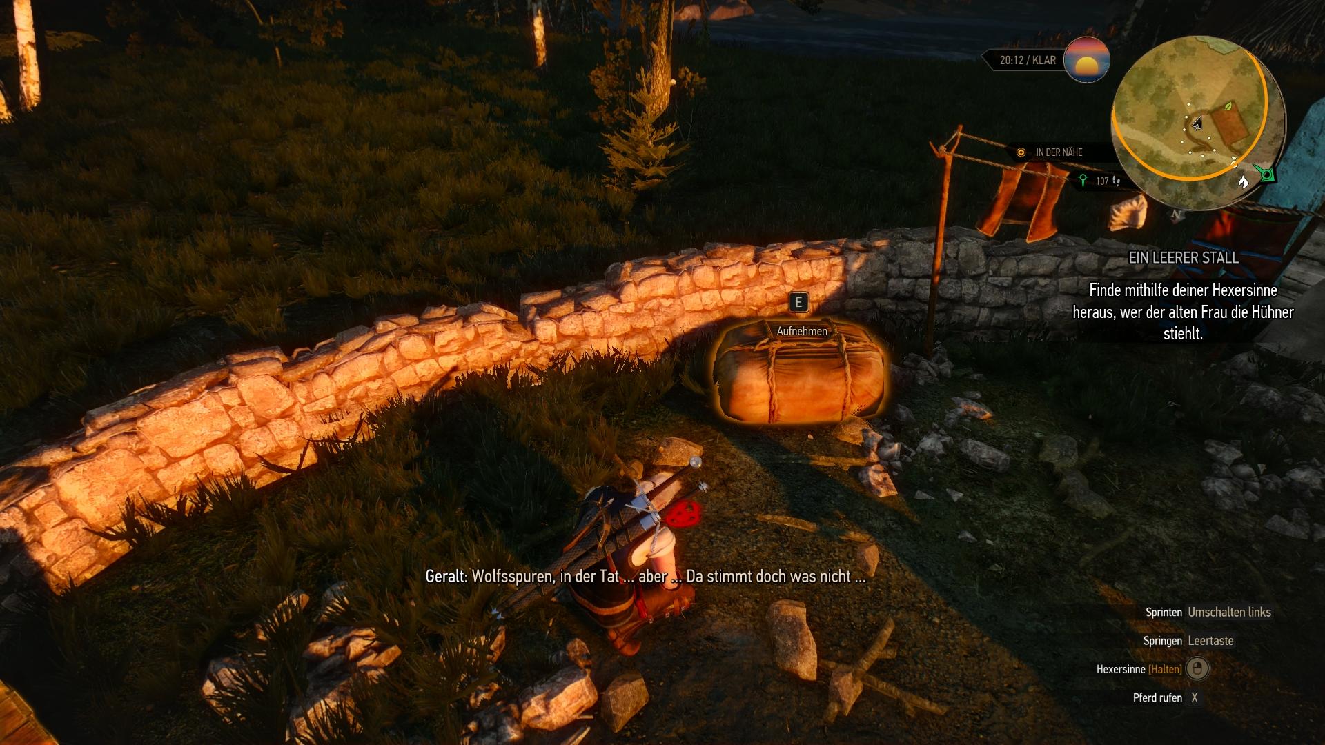 Auf den Sturmfeldern von Novigrad, zwischen der Imkerei Honigwab und dem Dorf Alness liegt die kleine Hütte von Janina [40]. Die ältere Dame berichtet von Hühnern, die nach und nach von ihrem Hof verschwunden sind. Da ihr Mann der beste Walddieb weit und breit war, versteht sie selbst auch etwas vom Fährtenlesen und glaubt einen Wolf gesehen zu haben, der nur auf zwei Pfoten läuft. Untersucht die Wolfspuren nahe der Gartenmauer. Etwas weiter sind neben den Wolfsspuren ebenfalls kleine Fußspuren zu finden, aber keine Kampfspuren, als ob die beiden zusammengehören würden. Sie führen durch den nahegelegenen Fluss und am anderen Ende zum Lagerplatz einiger Kinder. Die Bande hat einige komische Einstellungen zum Leben und die Wolfsspur mit Absicht als Ablenkung gelegt, sie sind aber total ungefährlich. Im Anschluss an dieses Gespräch dürft ihr zu Janina zurückkehren und die Entscheidung zum Ausgang der Quest treffen: