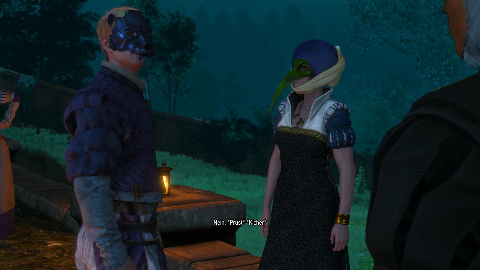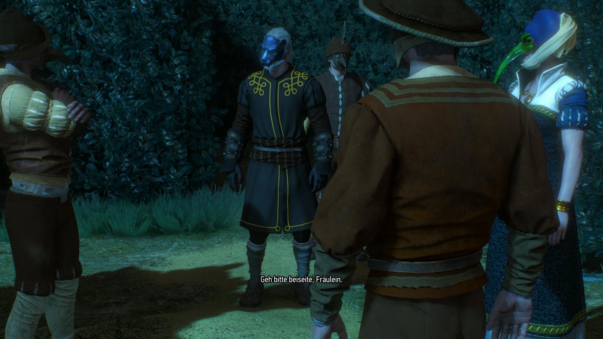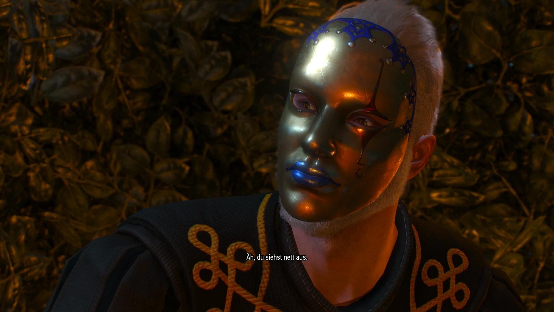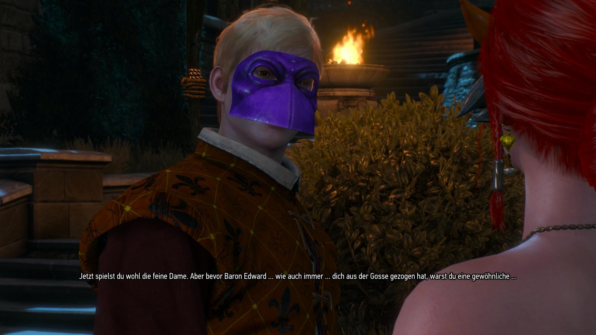 Habt ihr euch in Schale geschmissen, bekommt ihr direkt ein "Donnerwetter" und Lob zu hören. Andernfalls ist Triss enttäuscht. Damit geht es direkt weiter zum Vegelbud Anwesen. Die Waffen müsst ihr jedoch am Tor abgeben, da hilft kein meckern. Am Ende der Allee wird Triss von einem unverschämten Kerl mit einer violetten Maske angemacht, der sie für eine bekannte Hure hält. Ihr könnt: