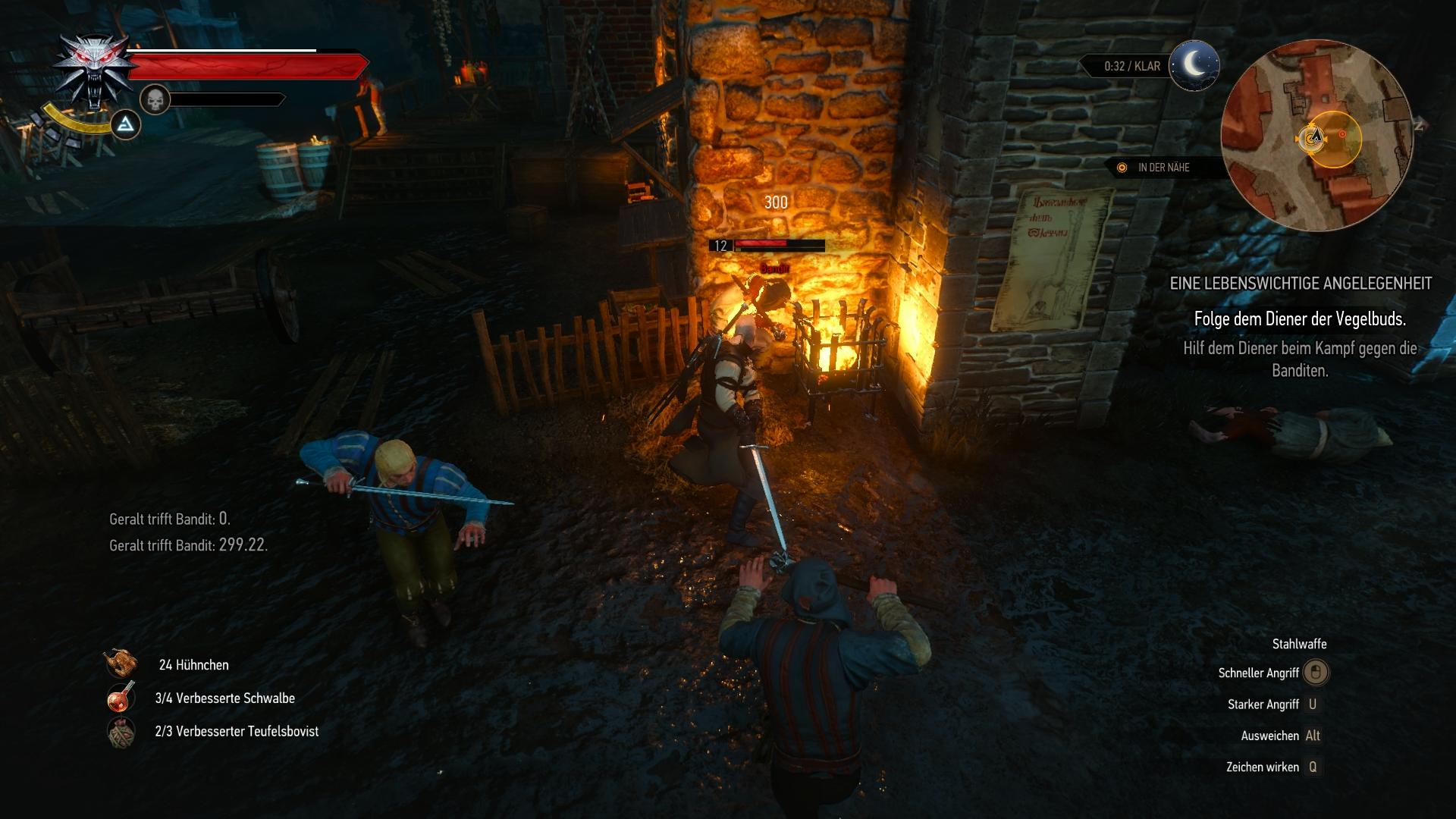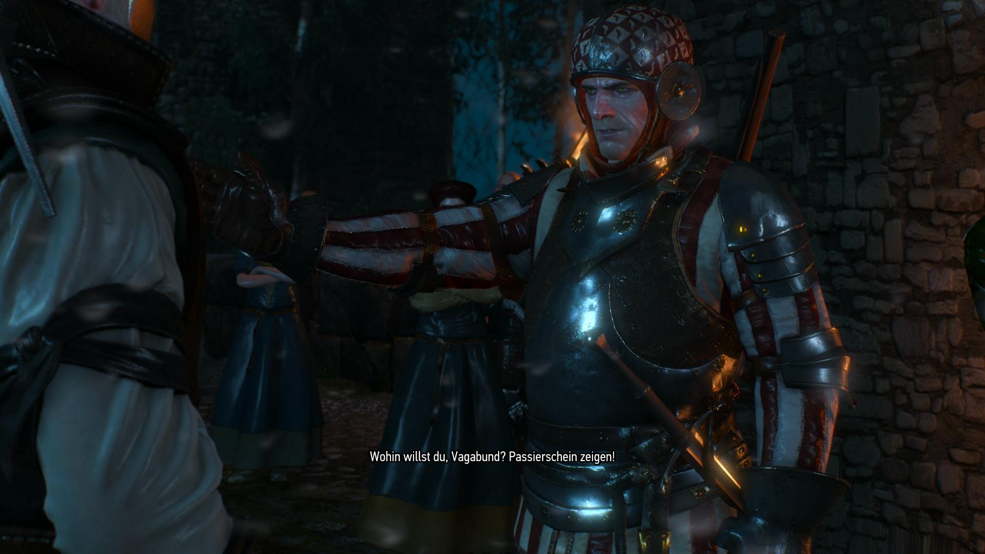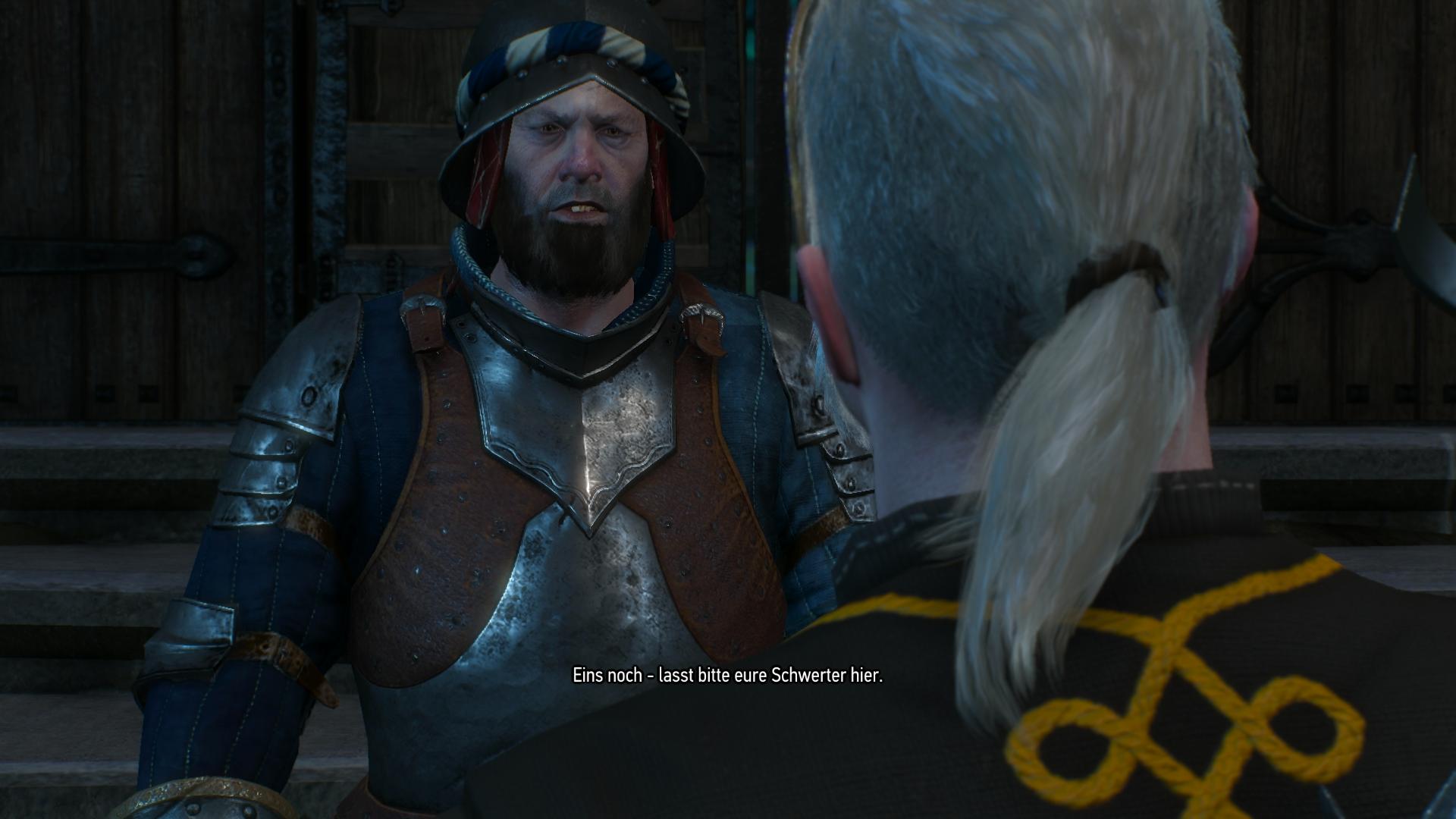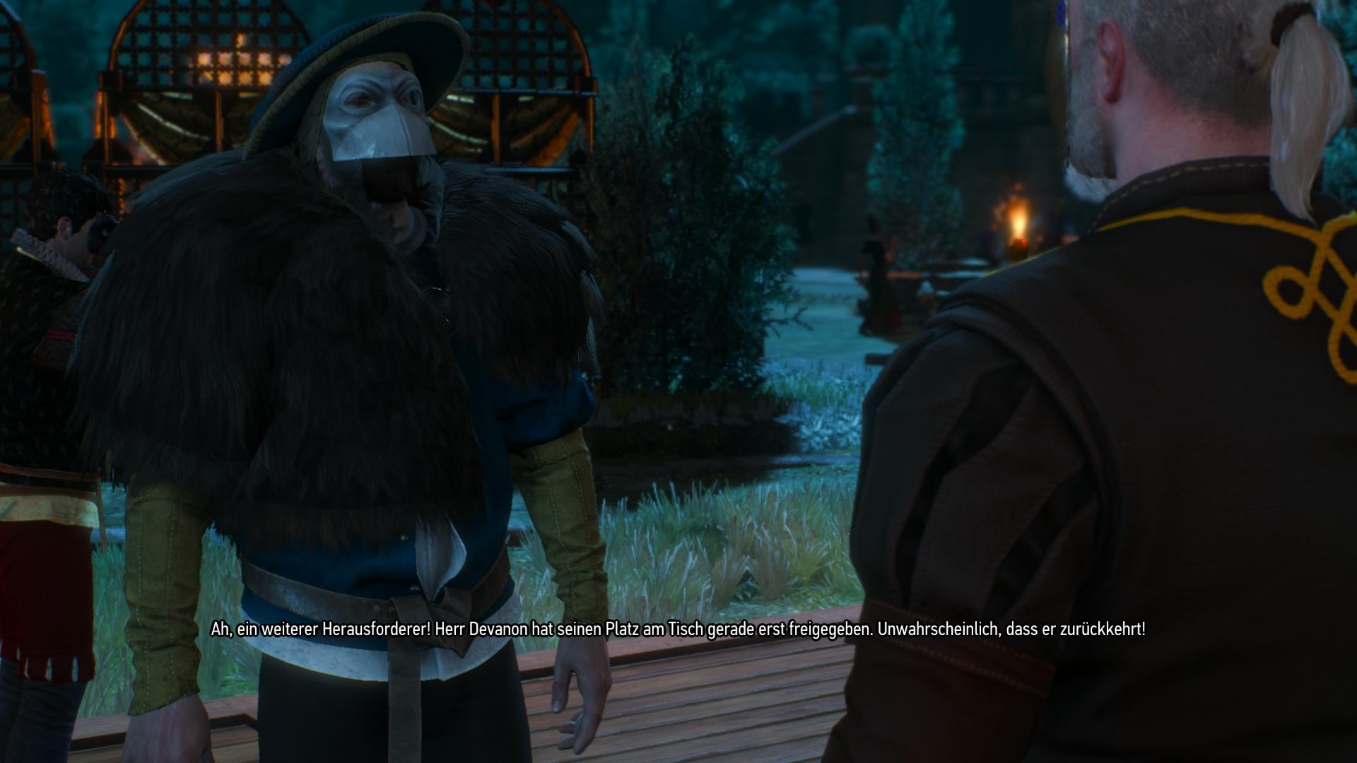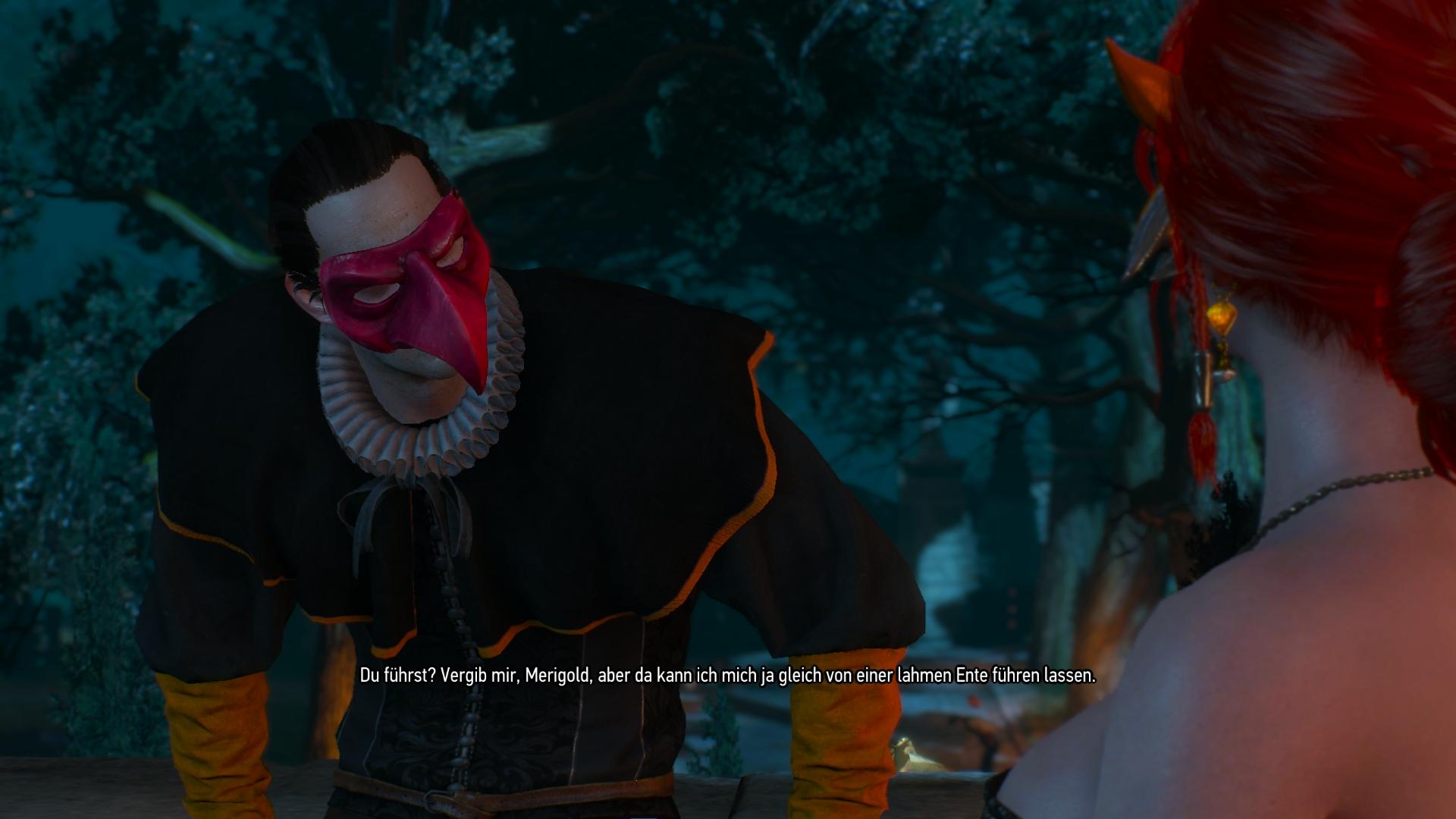 Habt ihr euch in Schale geschmissen, bekommt ihr direkt ein "Donnerwetter" und Lob zu hören. Andernfalls ist Triss enttäuscht. Damit geht es direkt weiter zum Vegelbud Anwesen. Die Waffen müsst ihr jedoch am Tor abgeben, da hilft kein meckern. Am Ende der Allee wird Triss von einem unverschämten Kerl mit einer violetten Maske angemacht, der sie für eine bekannte Hure hält. Ihr könnt: