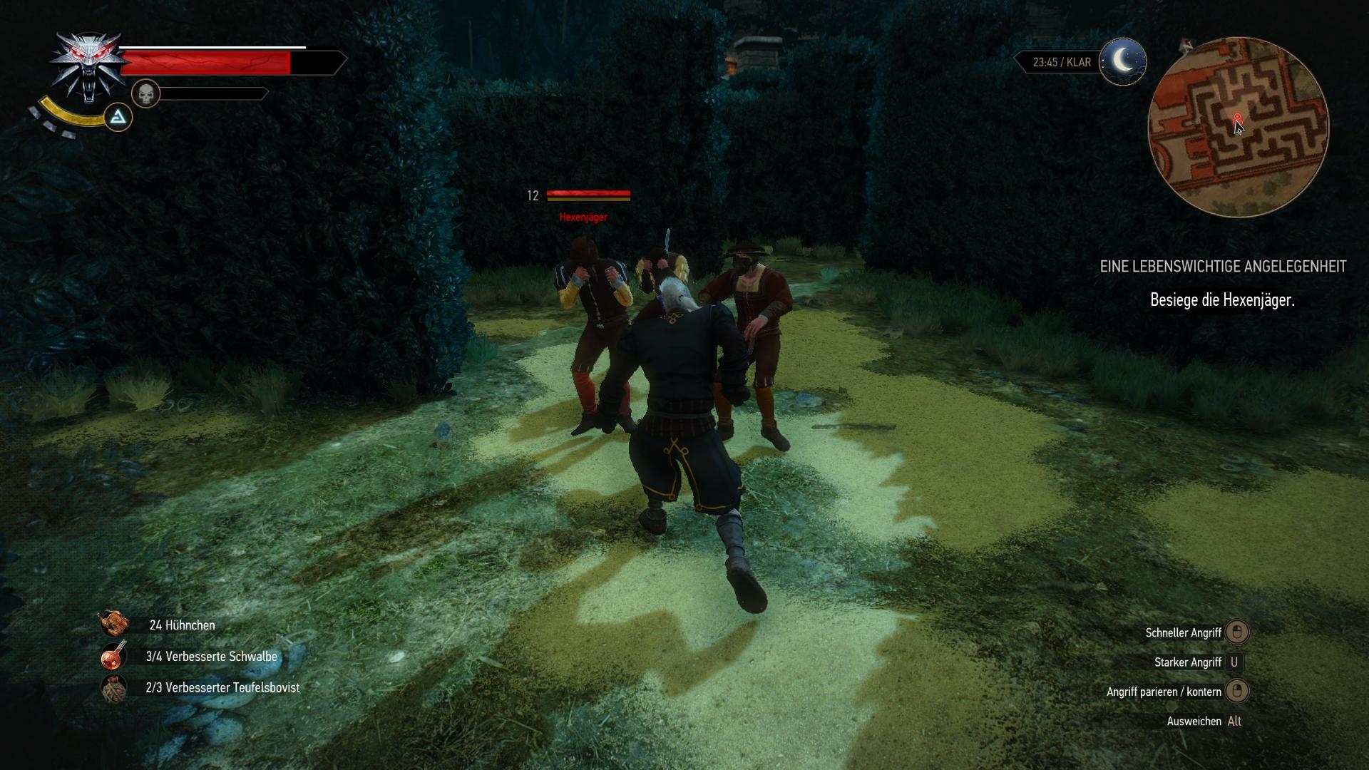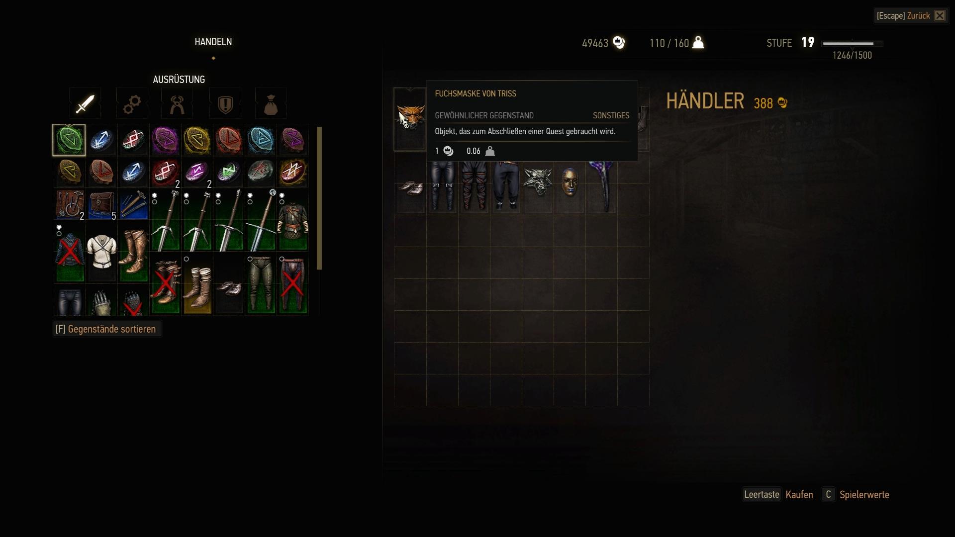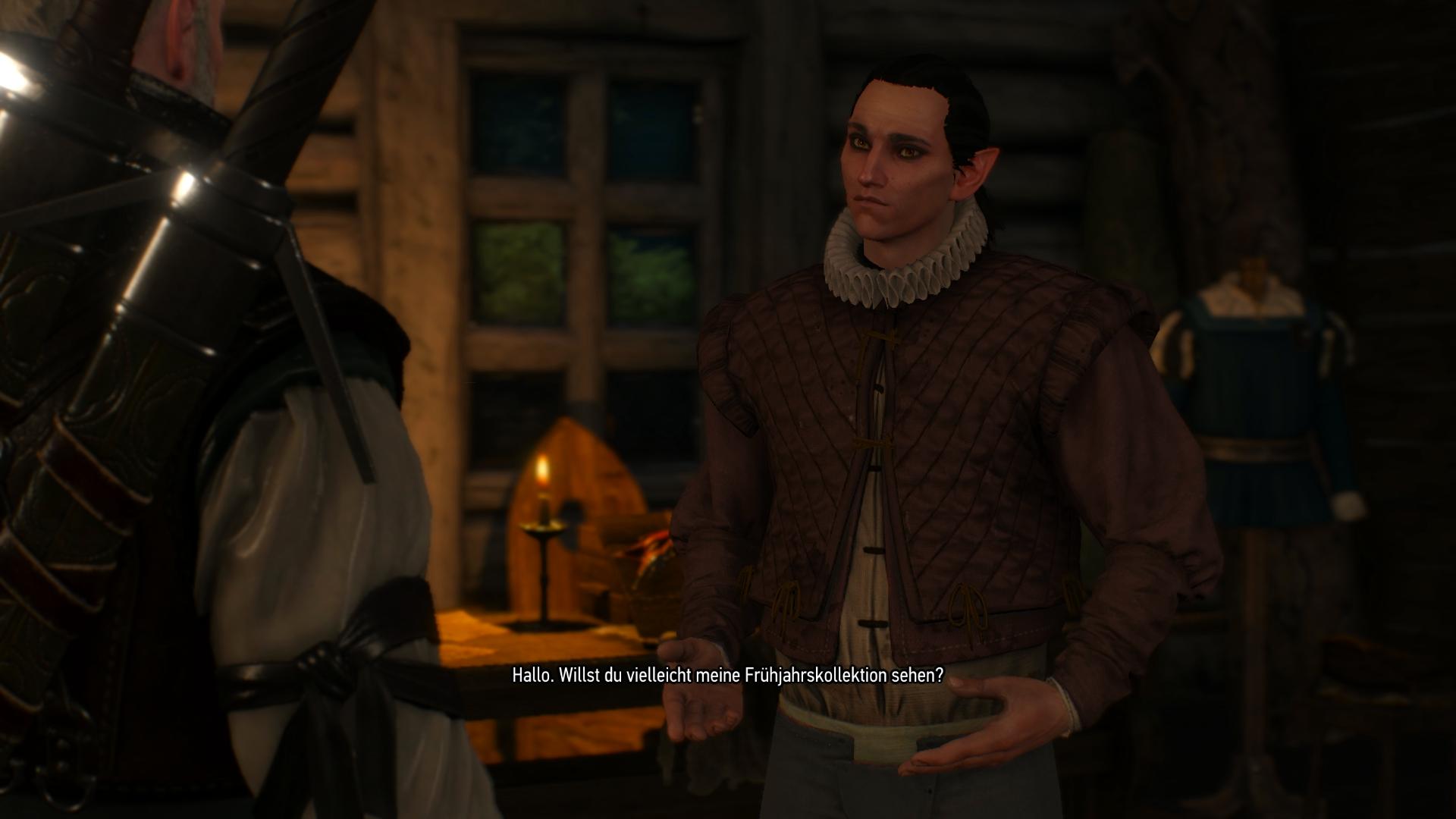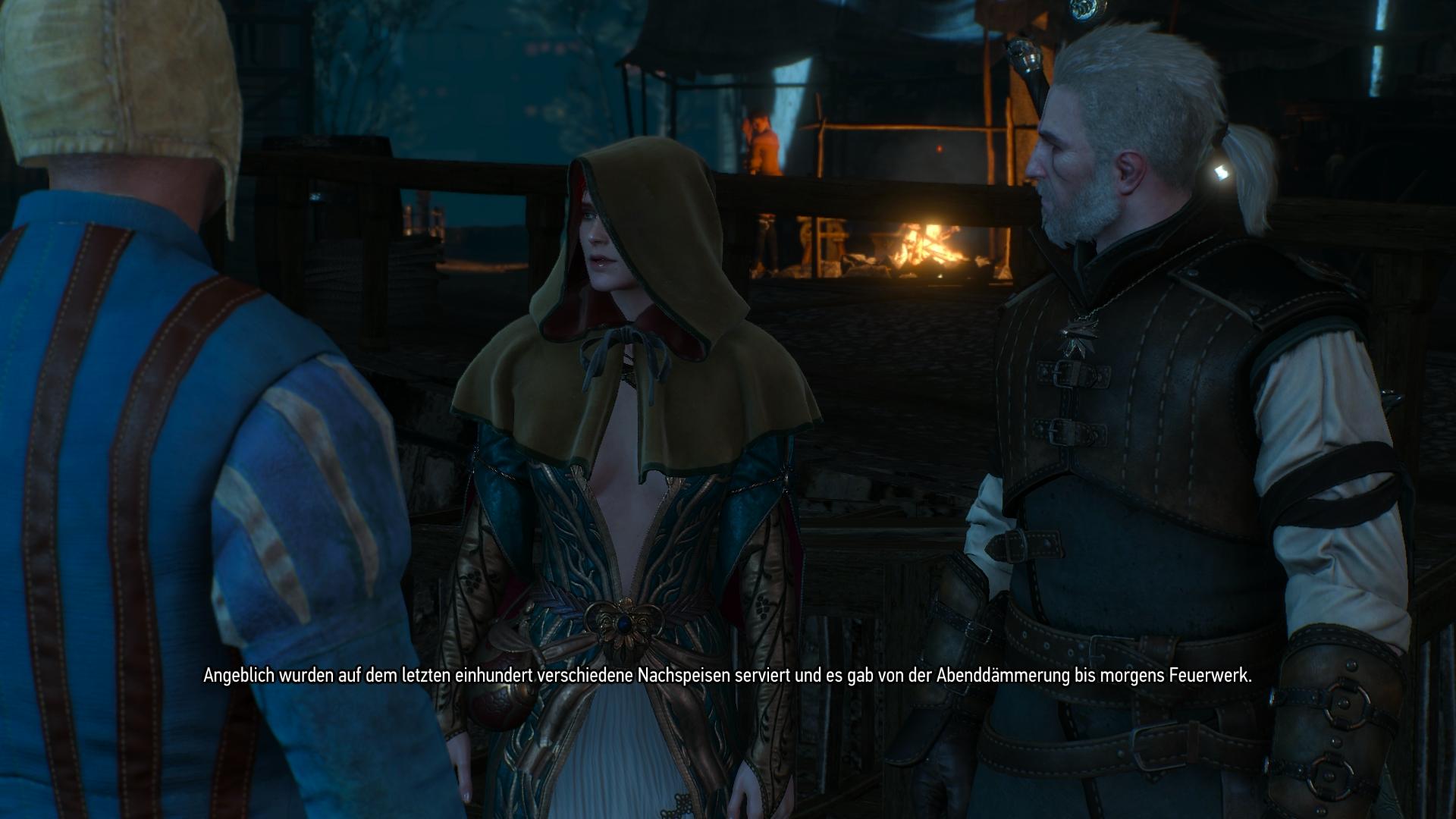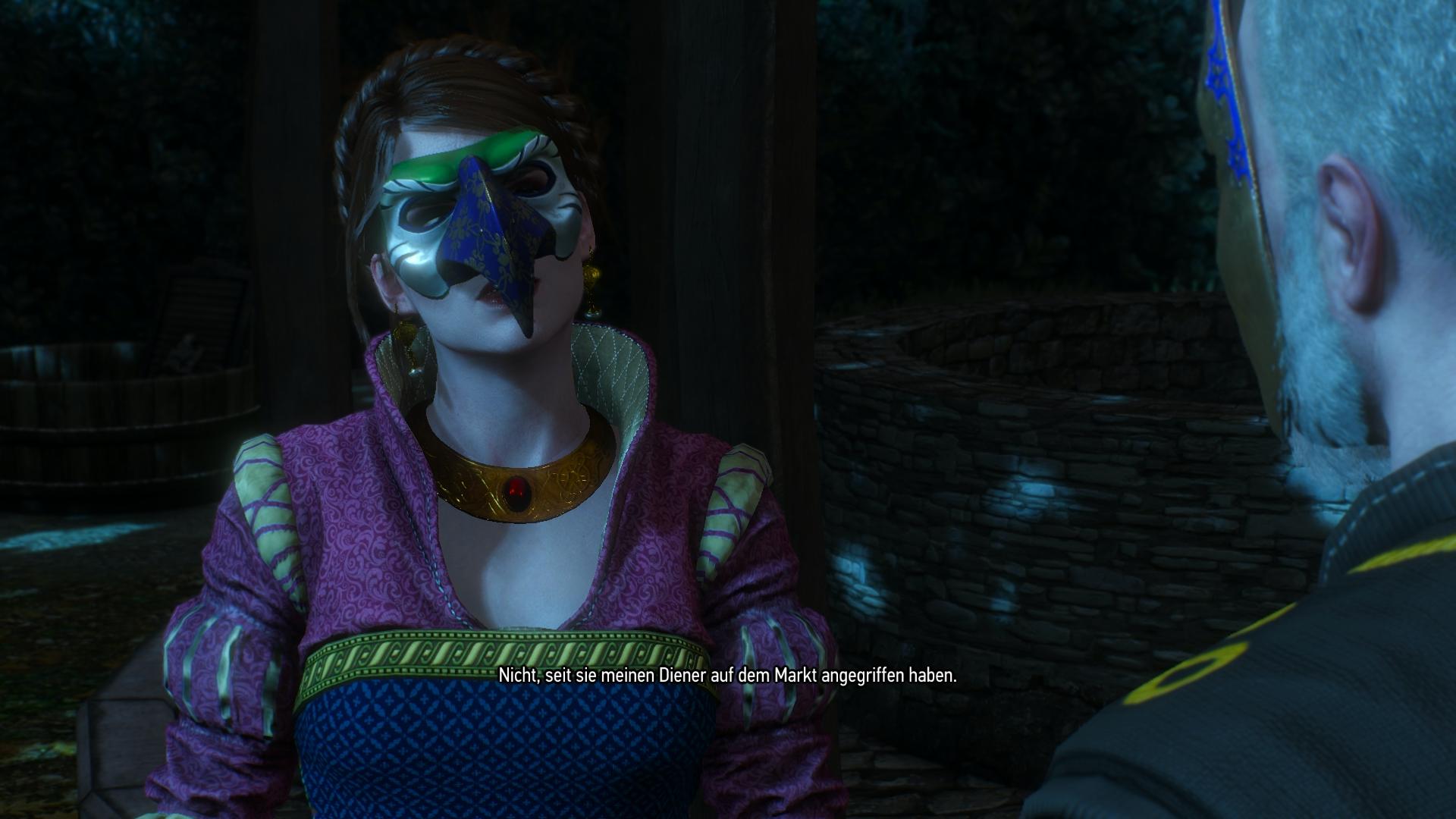 Es handelt sich um den Mann, mit den Längsstreifen auf dem Hemd, im südlichen Zentrum des Marktplatzes [15]. Folgt ihm über die Brücke im Süden. Beim Durchschreiten des Tores werdet ihr von drei Banditen überfallen. Anschließend ist der Diener der Vegelbuds gesprächiger. Er erzählt, dass Ingrids Sohn Albert wegen seinen Alchemiekenntnissen von der Tempelwache gesucht wird und seine Mutter ihn deshalb aus der Stadt schaffen will. Das Vorhaben soll bei einem riesigen Fest auf dem Landsitz der Vegelbuds stattfinden. Wozu Triss mit Begleitung eingeladen ist. Auf Geralts abschließende Frage, ob sie direkt dorthin können, erwidert Triss, dass sie sich erst mal angemessen kleiden müssen und schickt Geralt zu Elihals Laden [19]. Das Geschäft sollte euch aus der Mätressenliste Quest noch bekannt sein. Kauft bei Elihal die Fuchsmaske für Triss sowie eine beliebige für Geralt. Falls ihr Triss auf der Feier imponieren wollt, dann kauft zudem Oberteil, Hose und Schuhe eines nilfgaarder oder skellige Anzugs vom Schneider und zieht die Sachen direkt an, bevor ihr in Triss Wohnung zurückkehrt.