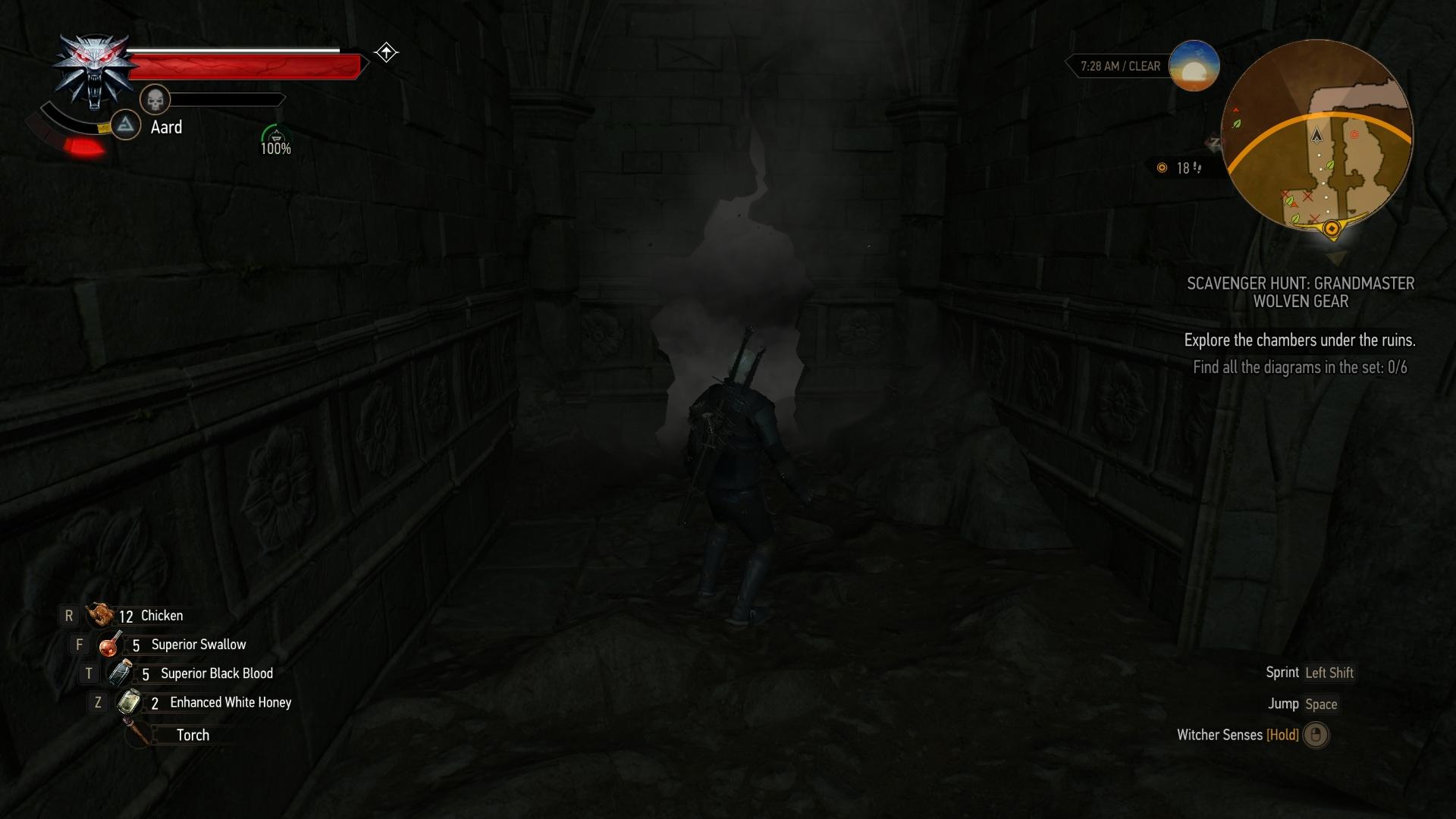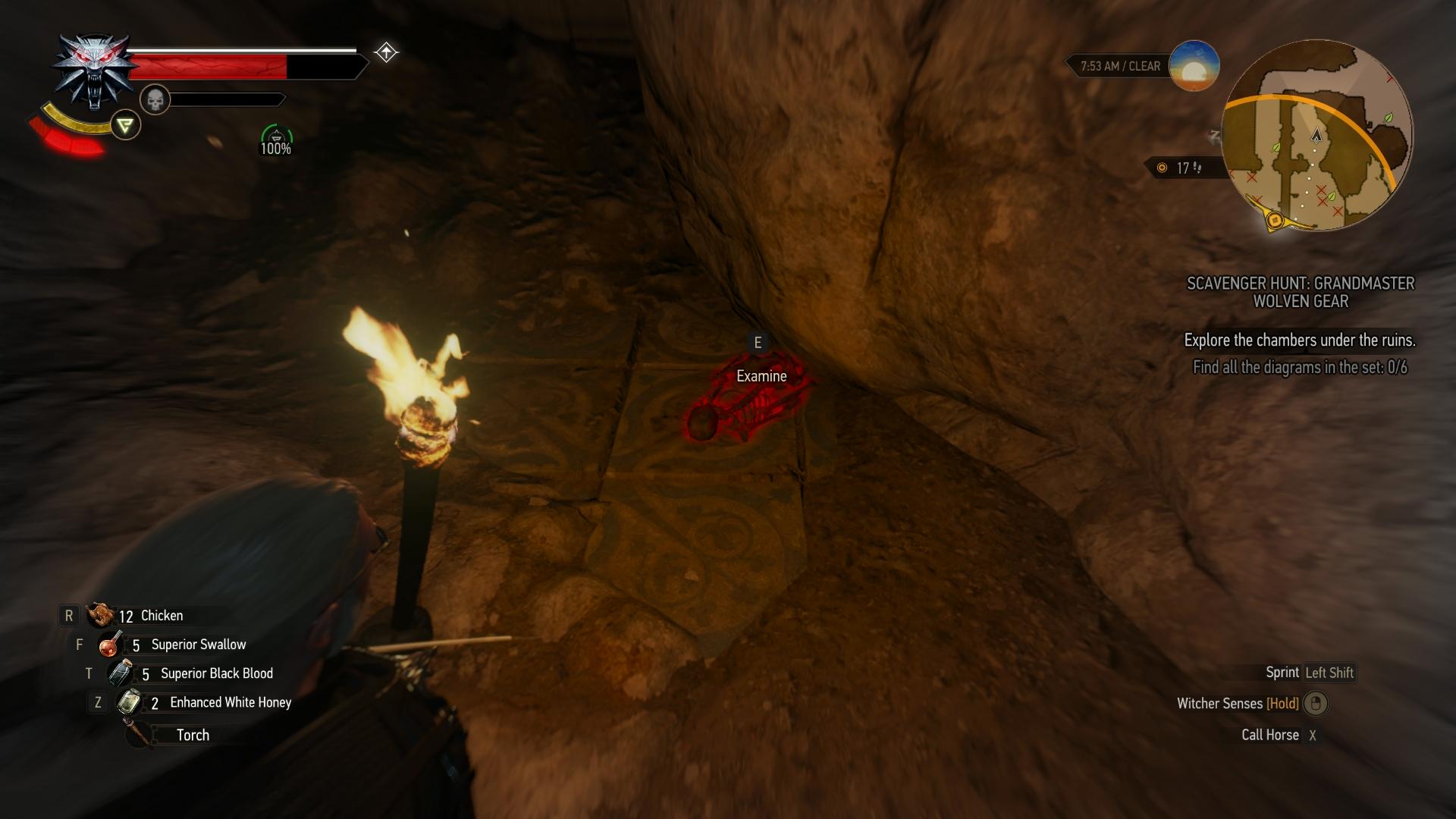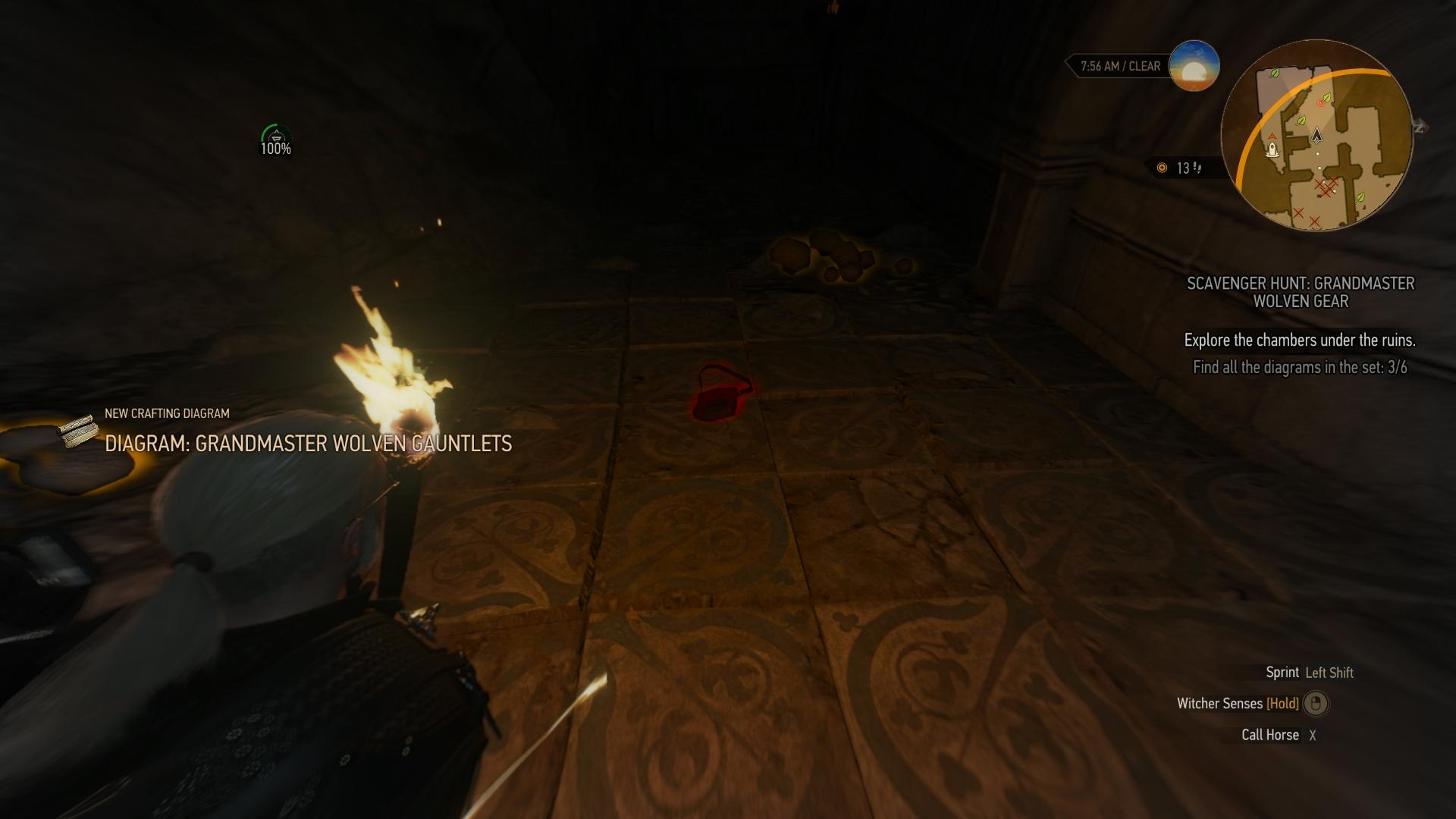 Zerstört die brüchige Wand im Nordosten (Aard-Zeichen). Folgt dem Verlauf des Ganges in die große Kammer mit dem Riesentausendfüßler, klettert die Felstreppe hinter ihm hoch und sprengt die nächste Wand auf (Aard). Nun seid ihr in der Kammer hinter dem Eingangsraum. Die Schemata liegen in den beiden seitlich angrenzenden Kammern. Geht zunächst in die kleine Kammer rechts. Das Skelett des Hexers auf dem Boden vor der Felsstufe hat die Schema für Wolfshandschuhe, -Stahlschwer und -Silberschwert bei sich. In der linken Kammer liegt eine Tasche am Boden, welche die verbleibenden Pläne für Wolfsrüstung, -Hose und -Stiefel beinhaltet. Geht in den nördlichen Raum, hebt den Schlüssel vor der Tür auf, entsperrt damit die Tür und verlasst die Ruine wieder.