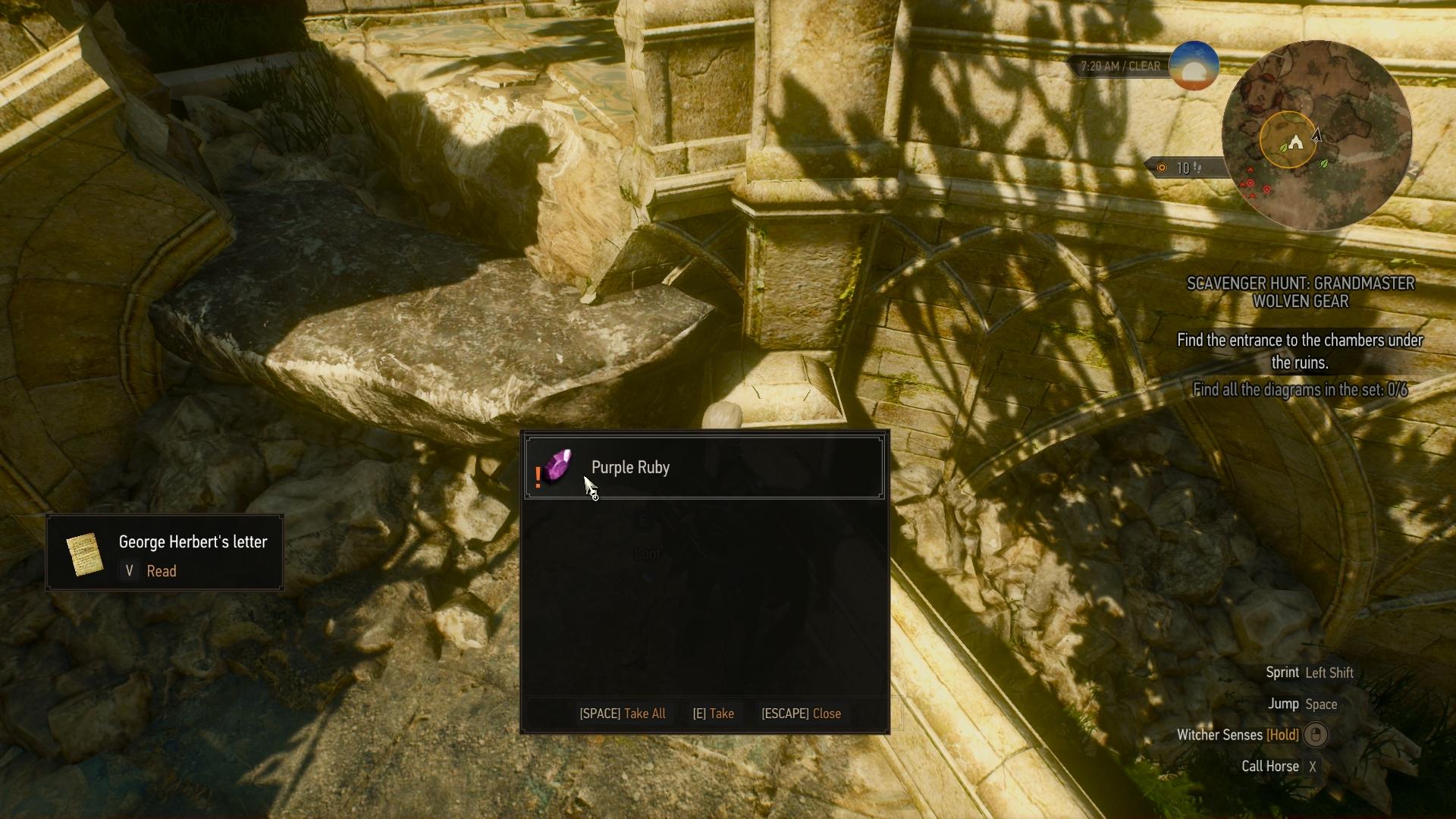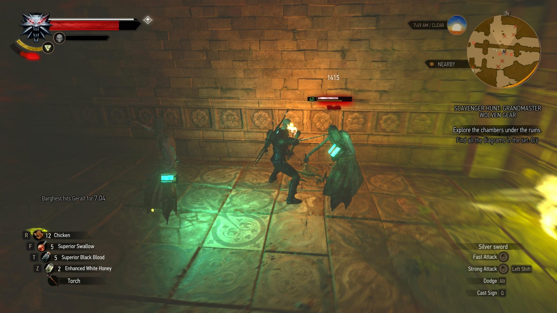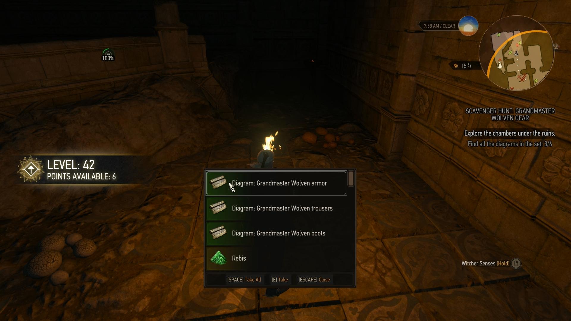 Zerstört die brüchige Wand im Nordosten (Aard-Zeichen). Folgt dem Verlauf des Ganges in die große Kammer mit dem Riesentausendfüßler, klettert die Felstreppe hinter ihm hoch und sprengt die nächste Wand auf (Aard). Nun seid ihr in der Kammer hinter dem Eingangsraum. Die Schemata liegen in den beiden seitlich angrenzenden Kammern. Geht zunächst in die kleine Kammer rechts. Das Skelett des Hexers auf dem Boden vor der Felsstufe hat die Schema für Wolfshandschuhe, -Stahlschwer und -Silberschwert bei sich. In der linken Kammer liegt eine Tasche am Boden, welche die verbleibenden Pläne für Wolfsrüstung, -Hose und -Stiefel beinhaltet. Geht in den nördlichen Raum, hebt den Schlüssel vor der Tür auf, entsperrt damit die Tür und verlasst die Ruine wieder.