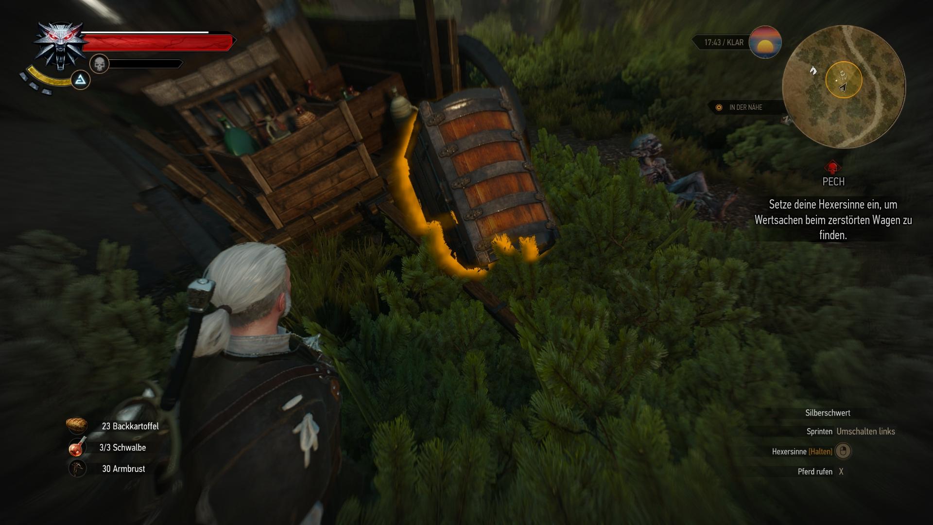 Geralt fand einen verlassenen Wagen und in der Nähe einen Brief, aus dem hervorging, dass die Fracht kostbar gewesen war. Der Hexer beschloss, den Brief genau zu lesen und sich dann gründlich umzusehen.