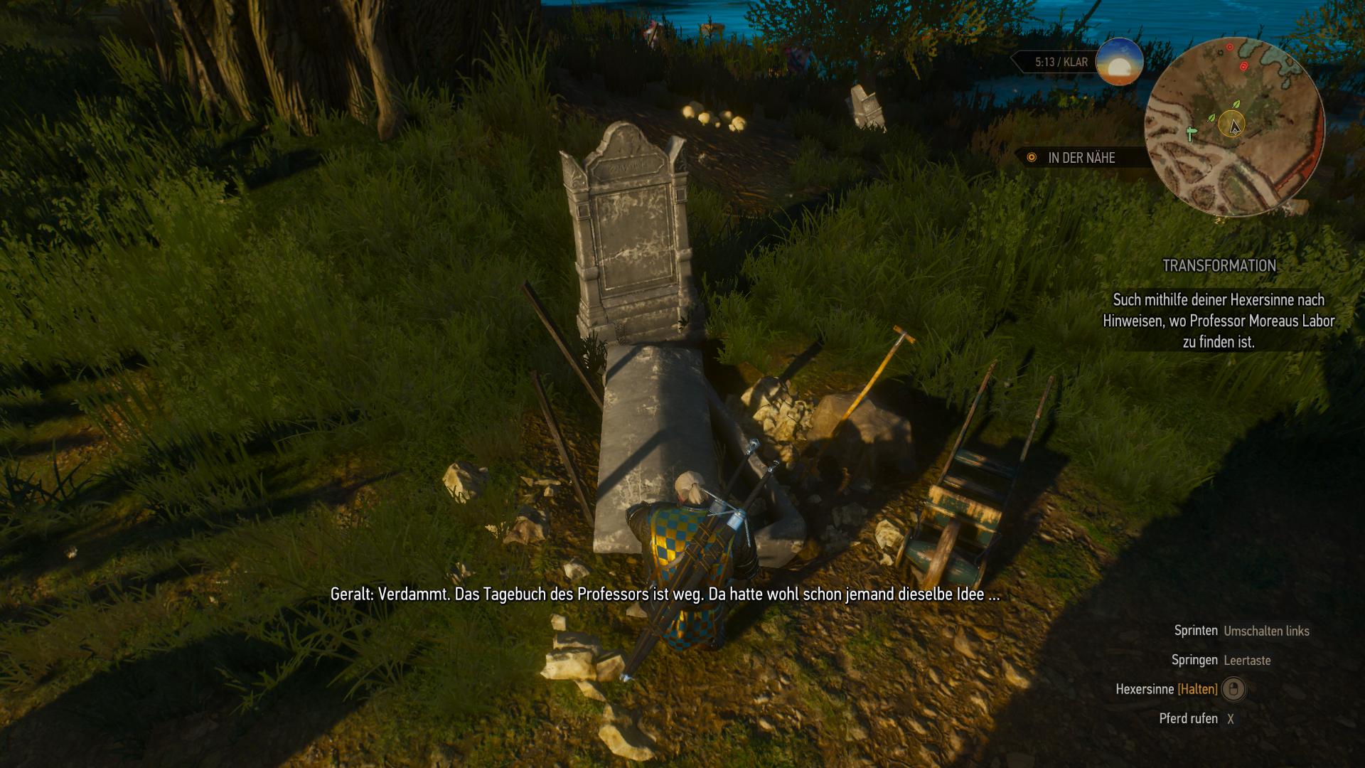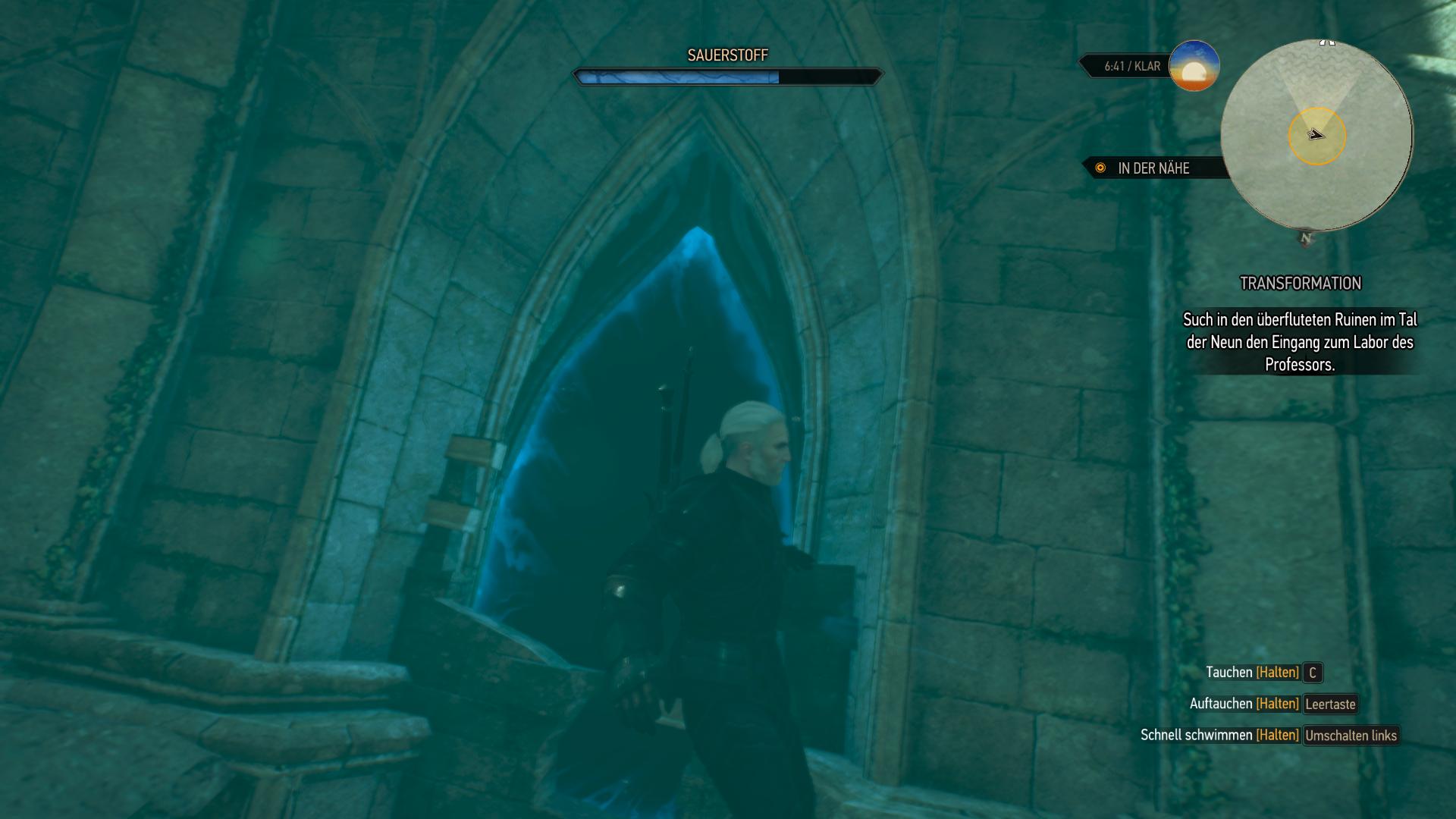 Sucht den Friedhof am Marjoranstor (Südende von Beauclair) auf, nachdem ihr Yens Brief gelesen habt und untersucht das geöffnete Grab vor dem gewaltigen Baum. An Tomas Moreau's Grab ist euch jemand zuvor gekommen. Seht euch kurz sein Skelett und dann die Fußspuren an. Sie enden am Stadteingang und euch bleibt nichts anderes übrig, als Yens Karte im Inventar zu untersuchen, um den Ort zu ermitteln. Das führt euch an Ufer südlich der Gefängnisinsel. Taucht am Nordende der Unterwasserruine hinab, um das magische Portal zu durchschwimmen. Falls ihr euch fragt, wie ihr die Truhe in der Unterwasserhöhle südlich des Eingang aufbekommt, die zählt zur "Angewandte Eskapologie" von der Gefängnisinsel.