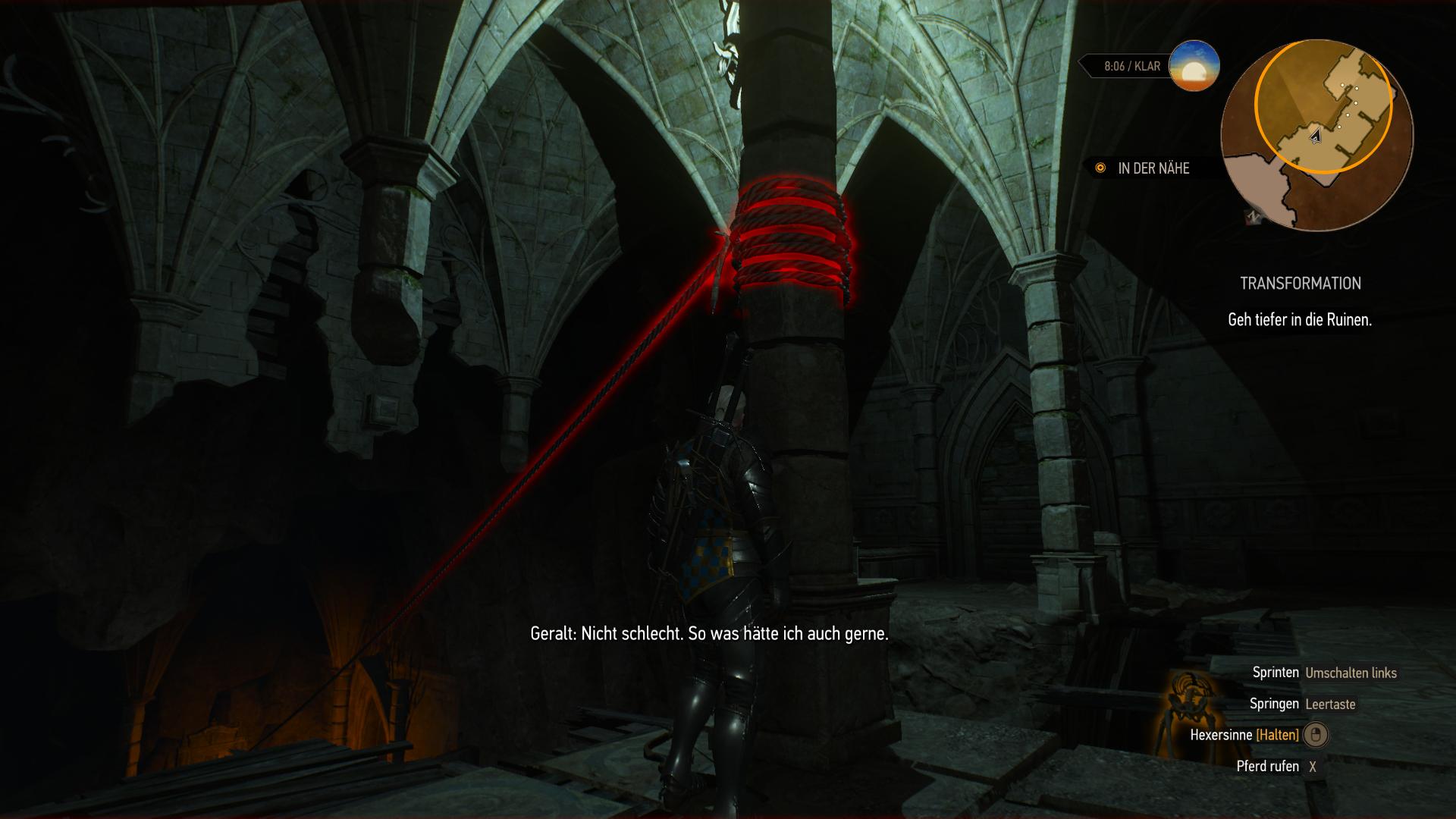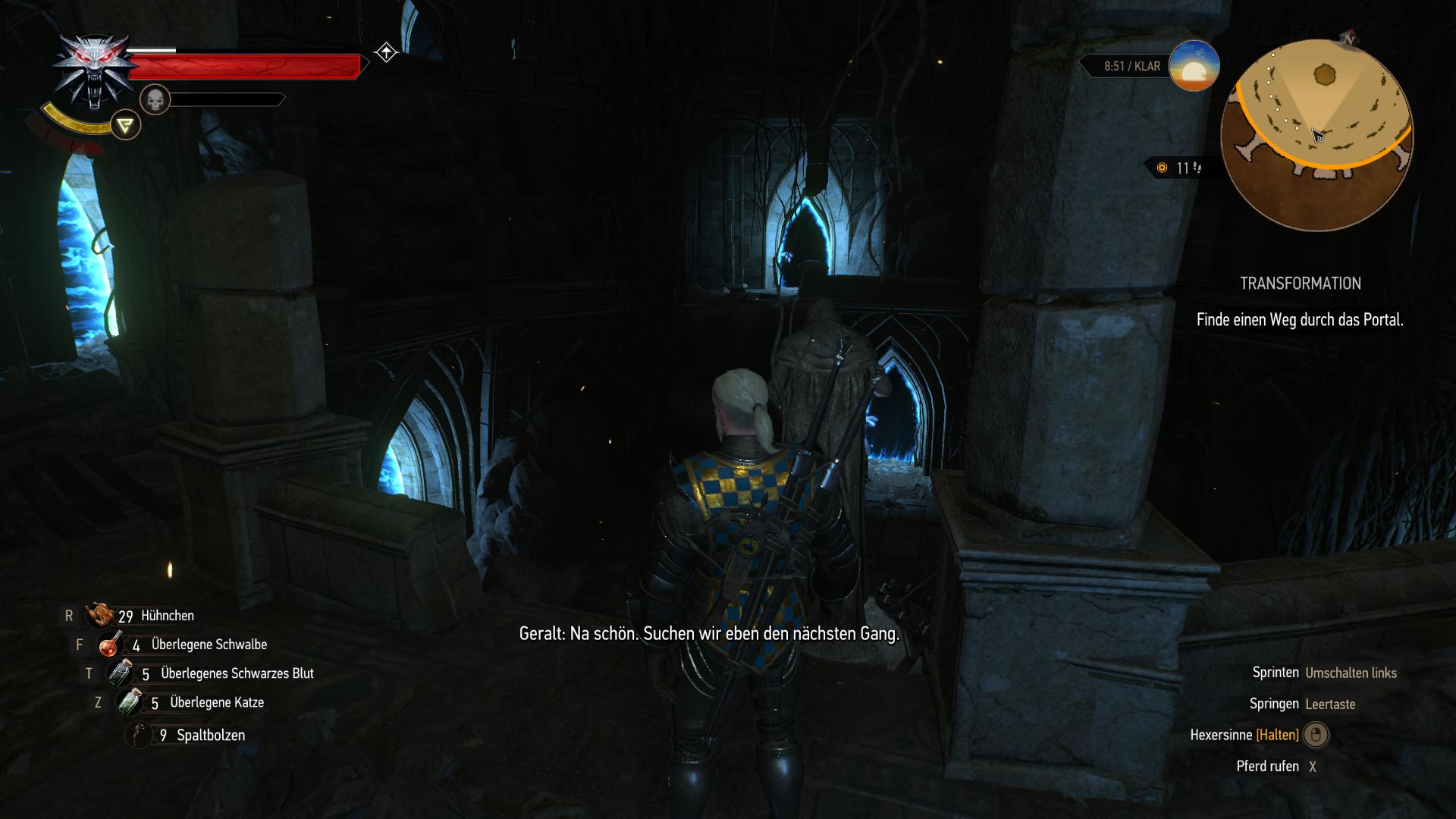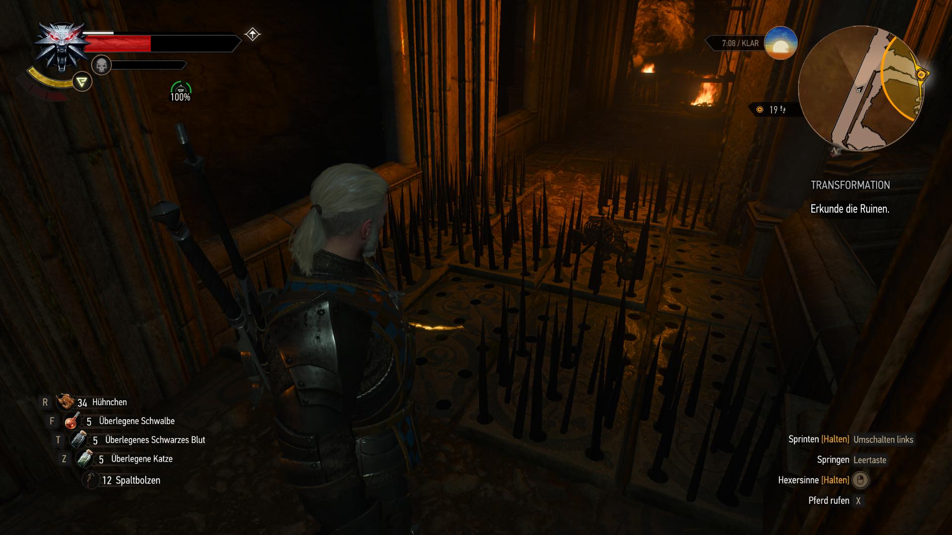 In den Ruinen hinter dem magischen Portal, gibt es weitere Hinweise auf den zweiten Abenteurer. Der Durchgang beim Sack unter der Brücke ist für Geralt jedoch zu schmal. Ihr könnt aber dort runter zur Treppe springen, um die Stacheln zu umgehen. Ansonsten geht es mit dem richtigen Timing natürlich auch über die Brücke. In der Sackgasse am Ende der Stacheln gibt es eine Truhe mit Handwerkszutaten. Davon abgesehen gelangt ihr zur selben Treppe, als wenn ihr gesprungen wärt.