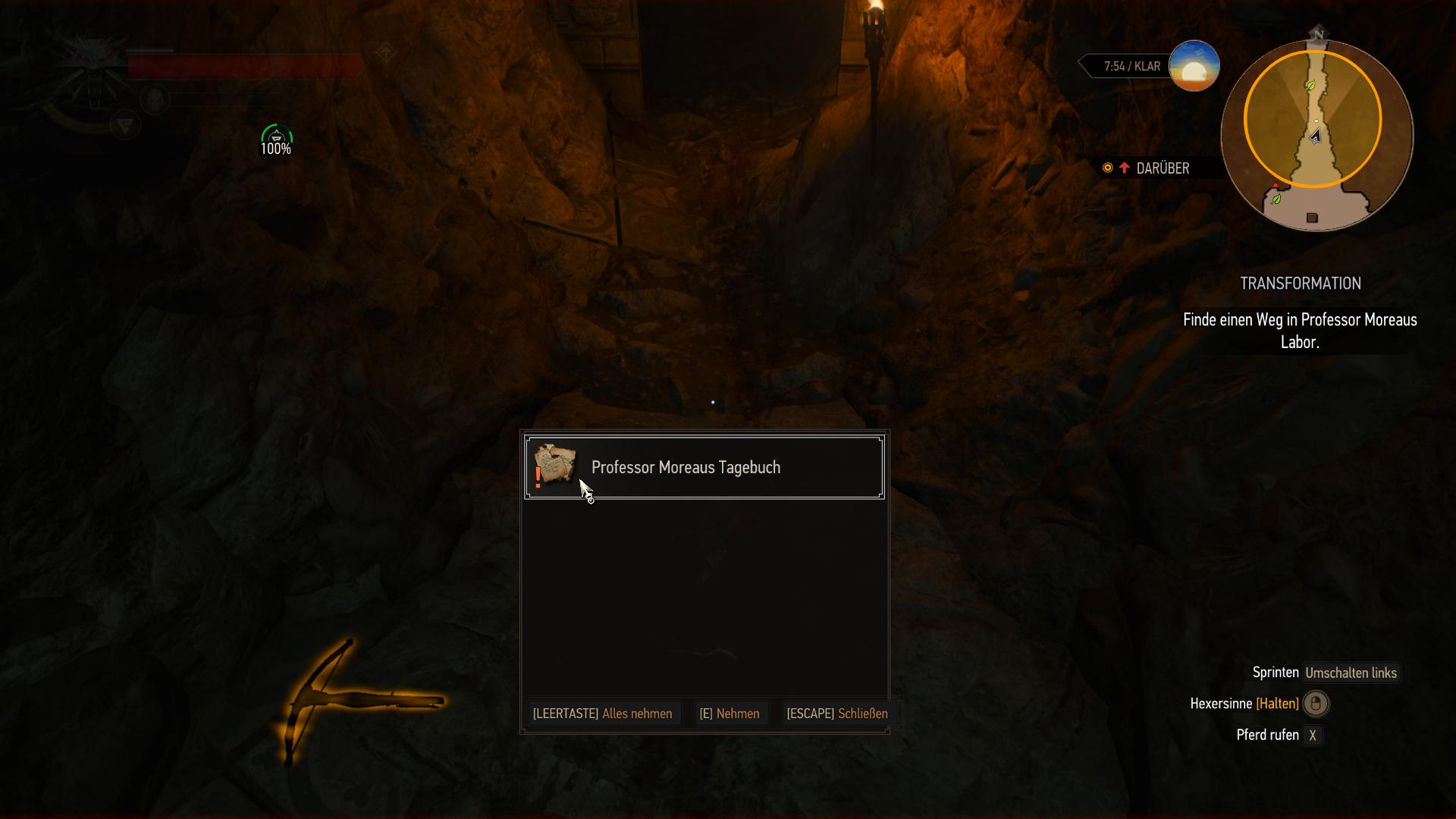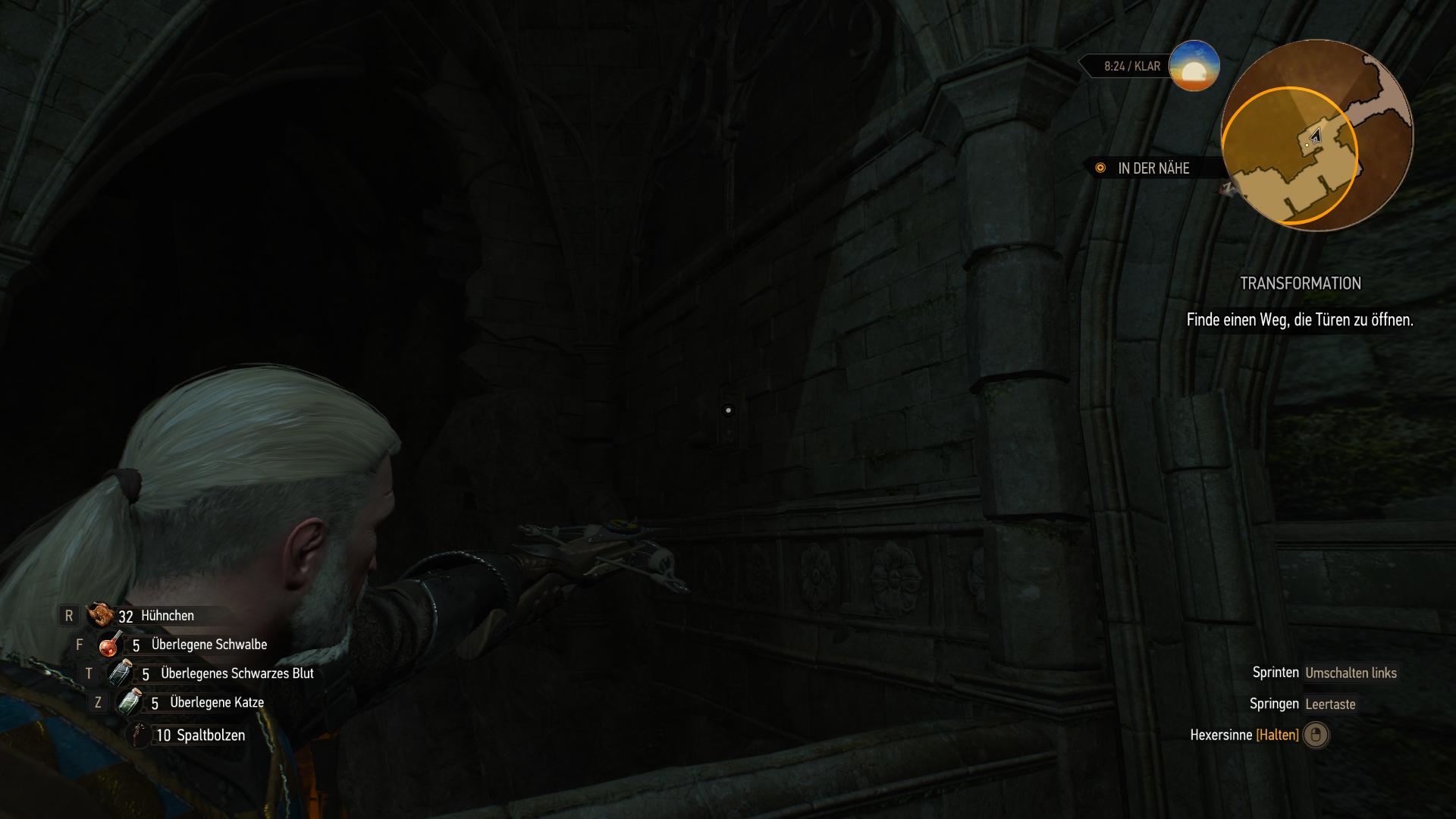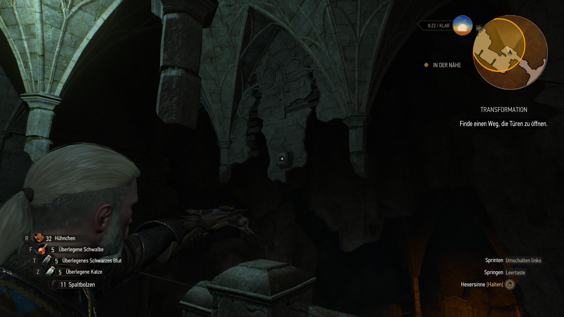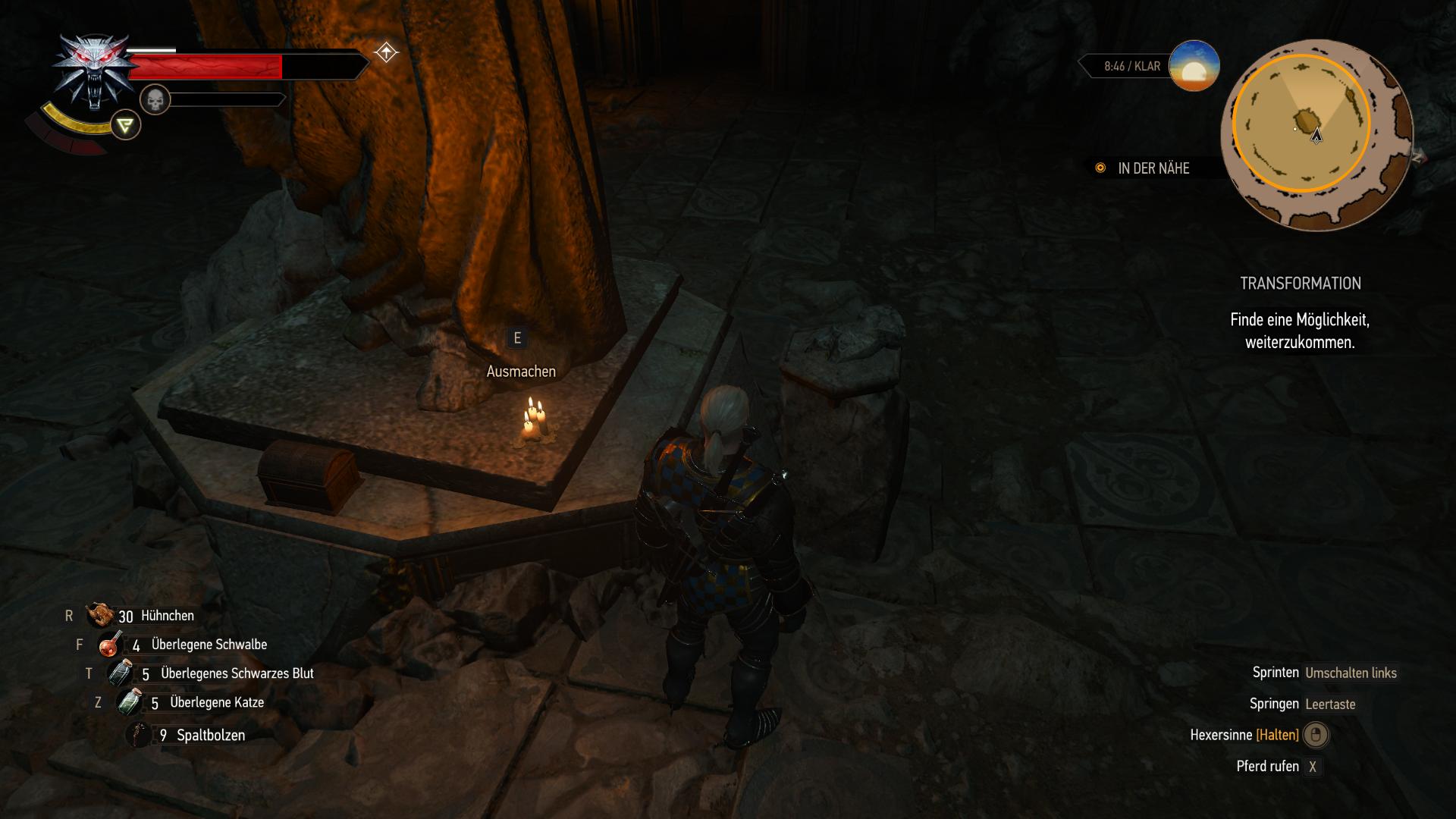 In der Arena unten, erwachen die beiden Panther-Statuen zum Leben und greifen euch blitzschnell an. Streckt sie nieder, damit die magische Barriere fällt und folgt dann weiter den Höhlen. In der nächsten Sackgasse gibt's erneut Handwerkszutaten und nachdem sich die Gabelung wieder trifft, findet ihr Professor Moreaus Tagebuch am Boden. Direkt dahinter ist die Kammer mit dem zweiten Wächter-Panther. Der Sieg über den Wächter bringt euch in eine Kammer weiter, wo euer Konkurrent sich offenbar auf die andere Seite abgeseilt hat. Geralt will sich an dem Seil jedoch nicht versuchen. Stattdessen müsst ihr die Tür mit den vier Riegeln am anderen Ende öffnen. Die Knöpfe dafür sind an den Wänden (über Geralts Kopfhöhe). Den südwestlichen und westlichen Steinschalter könnt ihr mit dem Aard-Zeichen oder der Armbrust aktivieren. Die anderen beiden (Südosten und Osten) sind zu weit entfernt und müsst ihr somit mit einem Armbrustbolzen anschießen. Das öffnet die Tür und bringt euch in den Statuenraum.