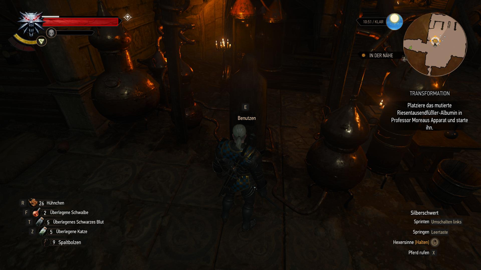 Somit ist die Quest beinahe abgeschlossen. Geht auf die Rückseite der Eisernen Jungfrau, setzt dort das mutierte Riesentausendfüßler-Albumin ein, zieht euch aus und steigt in die Maschine ein. Wenn Geralt giftgetränkt wieder daraus hervor kommt, ist das Hexermutationen-System aktiv. Ihr braucht das Labor nun nur noch durch das magische Portal im Norden verlassen, indem ihr den Kraftspeicher an der Wand davor aufladet.