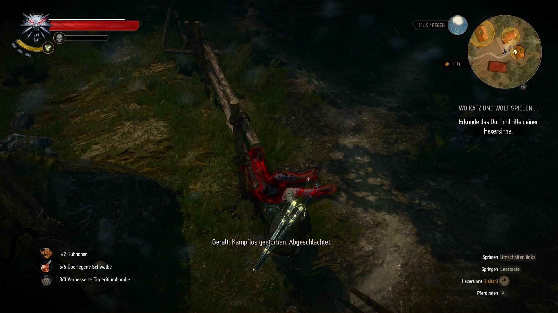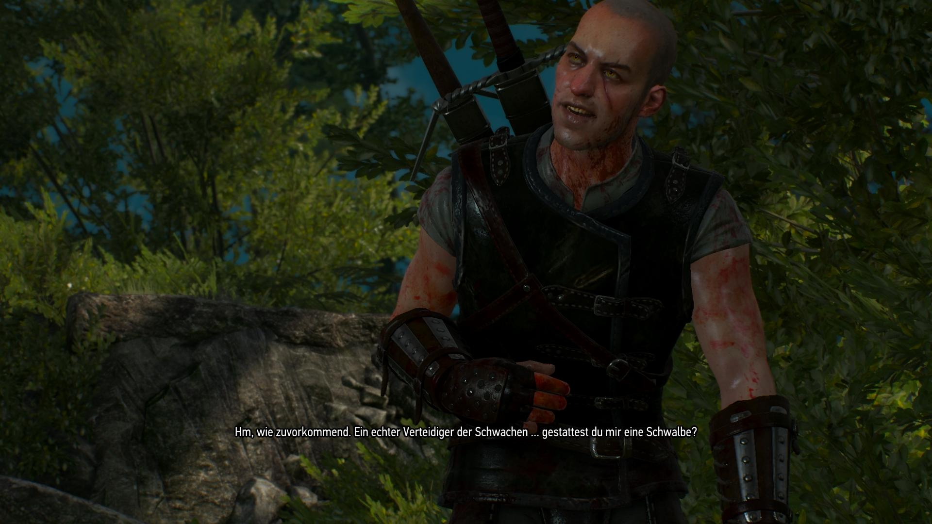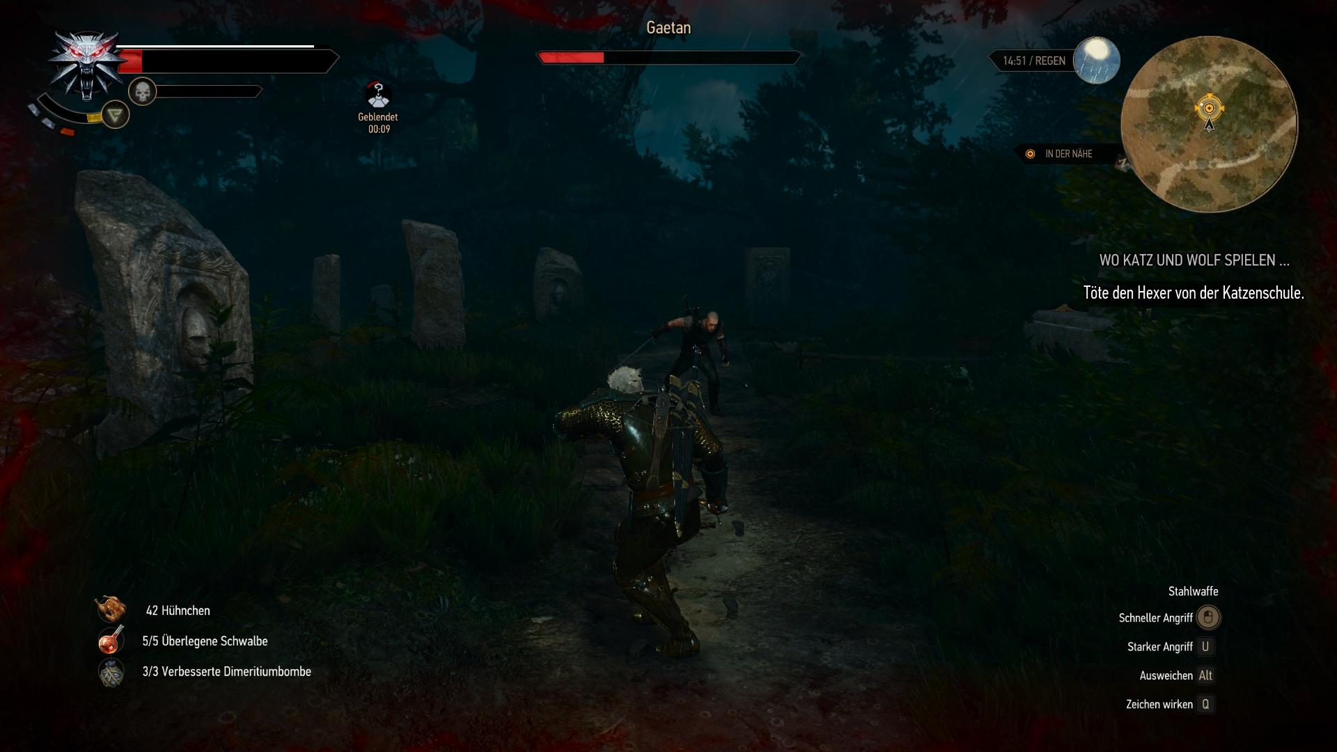 Entscheidet ihr euch zu einer beliebigen Stelle des Gesprächs für Gaetans Tod, bittet der verwundete Hexer um eine faire Chance und somit den Gefallen eine Schwalbe einwerfen zu dürfen. Gestattet ihr es ihm, wirft er euch stattdessen eine Bombe vor die Füße und blendet euch für den Kampf. Was das Vorhaben ihn zu töten natürlich drastisch erschwert. Mit Gaetans Tod bleibt euch nichts als Beute, außer seinem Silberschwert.