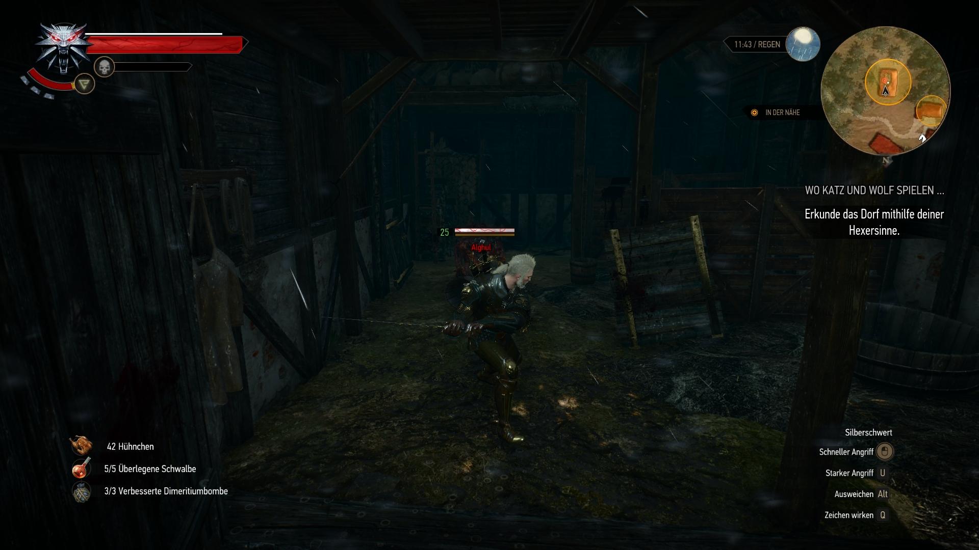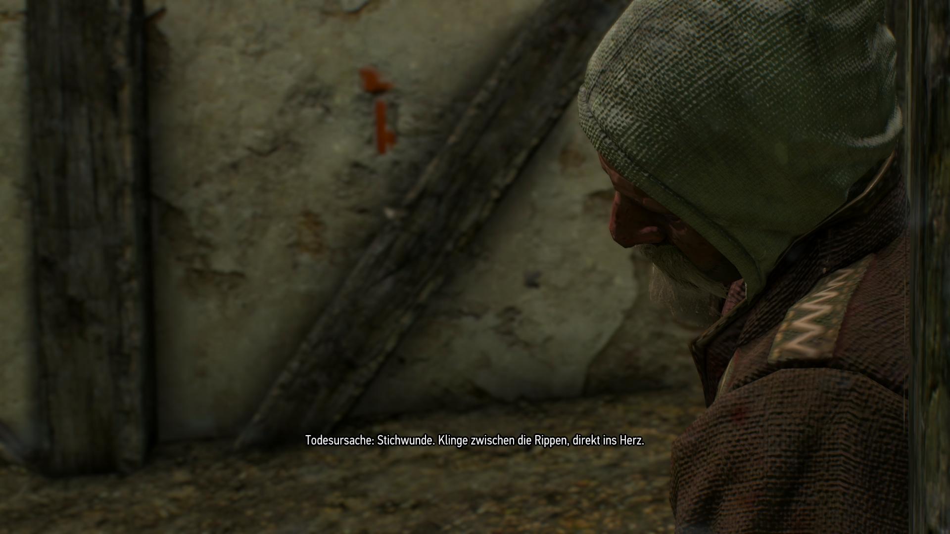 Der erste Schritt besteht darin die vier Gebäude mit euren Hexersinnen zu abzusuchen. Vor und in den Gebäuden findet ihr unzählige Tote und Kampfspuren. Entscheidend ist jedoch die südöstlich gelegene Scheune. Dort stoßt ihr vermutlich auf einen weiteren Alghul und in der hintersten Ecke auf den Leichnam eines alten Mannes, der aufgrund seines Aussehen ein hoher Tier gewesen sein muss. Er verstarb durch die Stichwunde einer Klinge zwischen den Rippen und hat wohl kurz vor seinem Tod dem Angreifer eine Silberkette abgerissen.