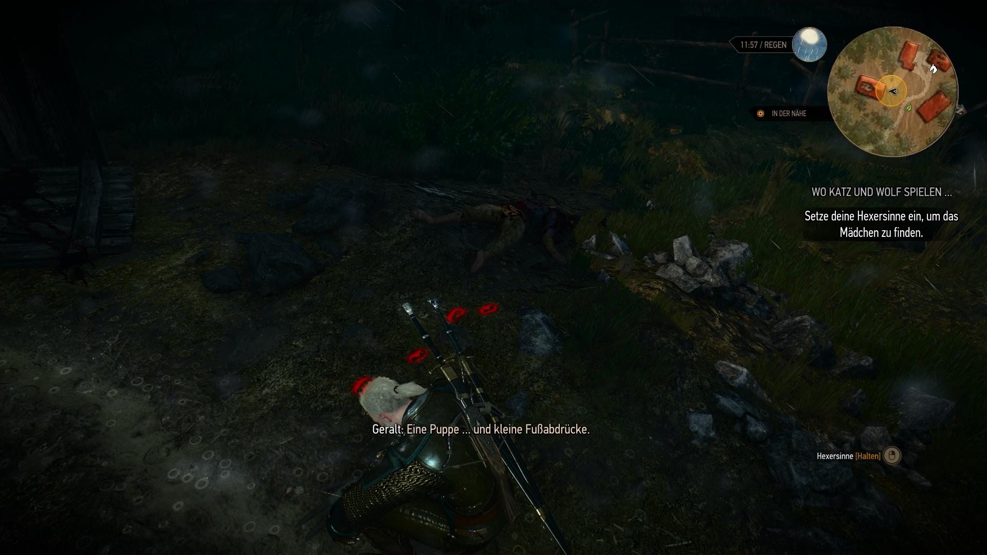 Im Anschluss an die Untersuchung sieht Geralt ein Kind an der Scheune vorbeirennen. Untersucht die Stelle, an der ihr das Mädchen saht, nehmt die Puppe mit und folgt den Fußabdrücken bis zu einem Baum südlich der Häuser. Millie bezeichnet Geralt wegen seinen Augen als Mörder. Wie sich rausstellt, hatte der echte Mörder ihrer Eltern ebenfalls Katzenaugen. Ihr könnt das Mädchen dazu bringen euch alles zu erzählen, indem ihr der Kleinen ihre Puppe wieder gebt oder sie mit Täuschung (Axii-Zeichen) überredet. Offenbar hat der Hexer seinen Auftrag erfüllt, kam mit der Trophäe zurück und dann brach ein Kampf aus. Abschließend gibt sie euch den Katzenkopf des Hexermedaillons, welches der Opa in der Scheune dem Hexer abriss.