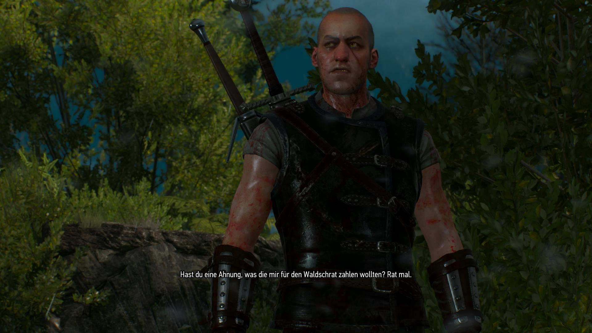 Lauft zum Steinkreis nordöstlich der Häuser, seht euch den blutigen Handabdruck am Felsen an und folgt dann den Fußabdrücken nordöstlich über die Straße. Am Schrein sitzend findet ihr den verwundeten Katzenschulen-Hexer Gaetan. In dem Gespräch habt ihr bei fasst jeder Äußerung Gaetans die Möglichkeit, ihn zum Kampf zu zwingen oder ausreden zu lassen, was logischerweise zu unterschiedlichen Ausgängen für die Quest führt: