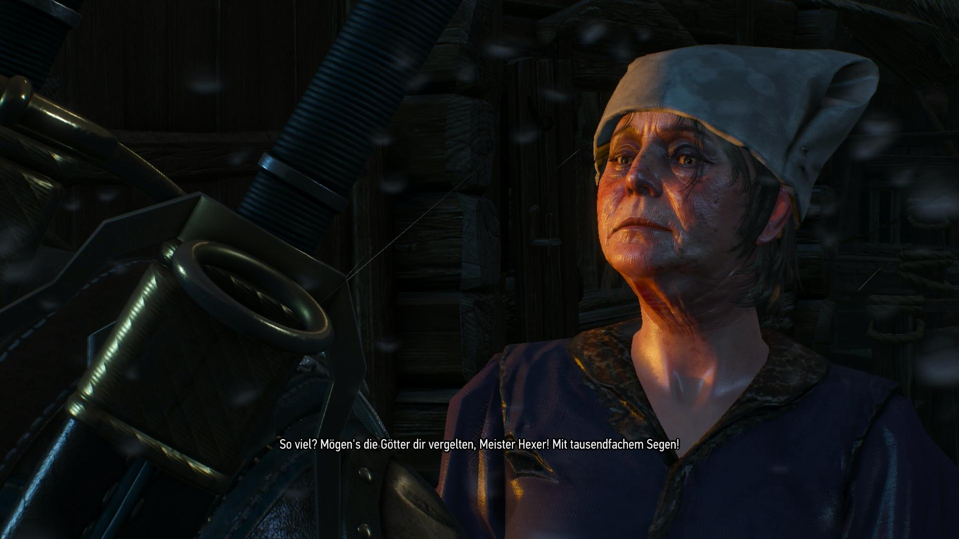 Lasst ihr den Hexer ausreden, erzählt er euch seine Geschichte, die sich mit den Schilderungen des Mädchens deckt. Er hat den Auftrag erledigt, die Bewohner wollten dann den Preis drücken und als er auf seinem Preis beharrte, griffen sie ihn an und er musste sich verteidigen. Was in dem Massaker endete. Beendet ihr das Gespräch mit "Ist nicht meine Aufgabe, dich zu verurteilen.", übergibt er euch den Schlüssel zu seinem Versteck, was die "Nimm, was du willst" Quest startet. - Du musst sterben