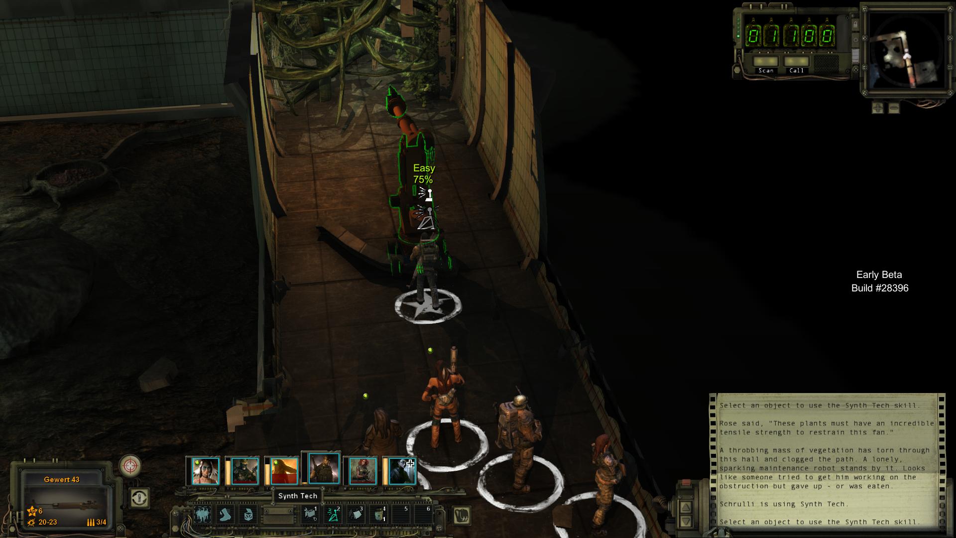 Öffnet mit der gefundenen Zugangskarte aus der Kiste die östliche Luftschleuse. Der Gang dahinter ist mit einem giftigen Gas gefüllt, weshalb ihr zunächst nicht mit der gesamten Gruppe reingehen solltet. Nehmt euren Charakter mit der besten "Lockpicking" Fertigkeit und lasst ihn die Tür auf der rechten Seite öffnen. In dem neu eröffneten Raum könnt ihr durch die Schalter an der Wand den einen aktiven Ventilator abschalten. Damit ist der Gang in der Mitte weiter begehbar. Auf dem Weg zum letzten Ventilator könnt ihr die Kiste im zweiten Raum auf der rechten Seite plündern. Zerfeuert die Ranken am fünften Ventilator und geht in die Tür dahinter. Von diesem aus könnt ihr jetzt den vierten und fünften Ventilator in Betrieb nehmen. Schickt anschließend einen weiteren Charakter in den ersten Raum und aktiviert von dort aus die Rotoren eins bis drei. Wenn ihr nun einige Sekunden wartet, wird der giftige Nebel davon geweht. Danach könnt ihr alle fünf Ventilatoren wieder abschalten und gefahrlos mit allen Gruppenmitgliedern durch den Gang laufen. Hinter der ersten Tür auf der linken Seite verbirgt sich übrigens eine weitere Pflanzenangriffstruppe und der Weg im letzten Raum vor der Leiter ist versperrt bis ihr die Pumpen in Gang gebracht habt. Wenn ihr wollt, könnt ihr den Komplex jetzt über die Leiter zum östlichen Feld verlassen.