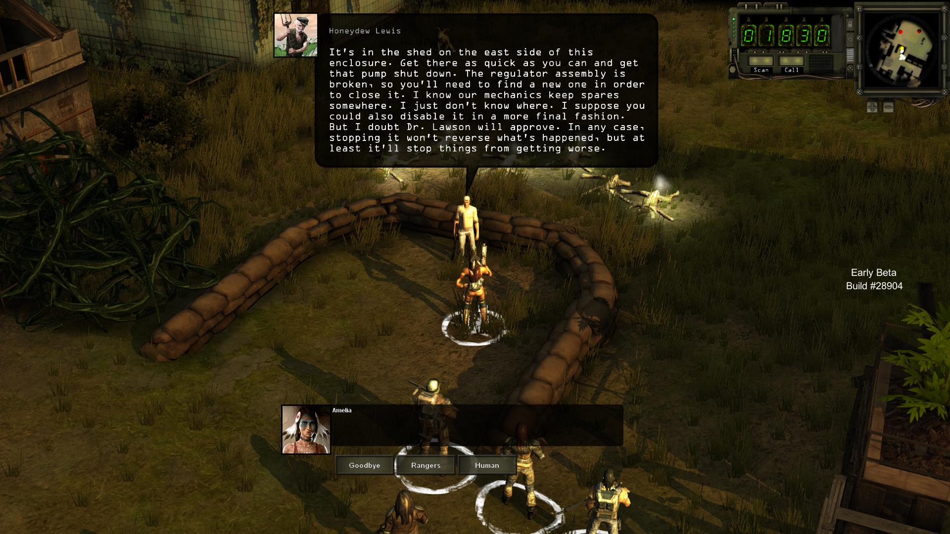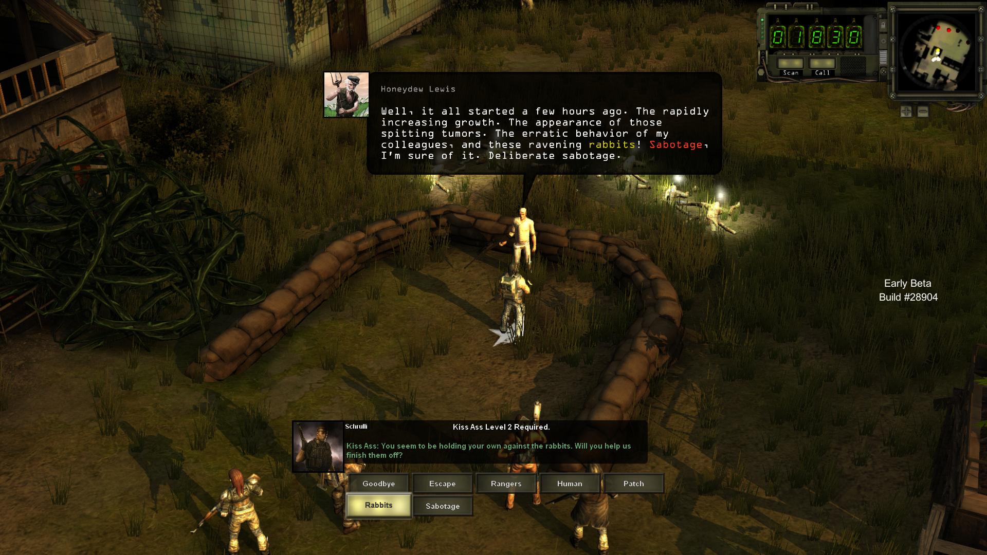 Auf dem westlichen Feld gilt es den Generator zu finden und unter Kontrolle zu bringen. Wie ihr nach wenigen Schritten aus dem Schuppen bemerkt, wird das Vorhaben aber zunächst von Killerkaninchen verhindert. Honeydew Lewis sorgt jedoch bereits für die Dezimierung der Nager. Nachdem er seine vernichtende Salven verteilt hat, könnt ihr mit ihm über die Geschehnisse auf dem Feld und den Generator plaudern. Nutzt dafür am besten einen Charakter mit "Kiss Ass" Stufe 2 Fertigkeit. Denn wenn ihr mit dieser Fertigkeit nach den Rabbits fragt, bietet Honeydew an sich euch anzuschließen. Achtung, ihr müsst die Gesprächsoption sofort nutzen. Fragt ihr Lewis erst über andere Dinge aus, verschwindet sie. Er kommt nicht als festes Gruppenmitglied mit, aber folgt eurer Gruppe fortan durch den gesamten Ag Center Comlex und greift helfend in jeden Kampf ein.