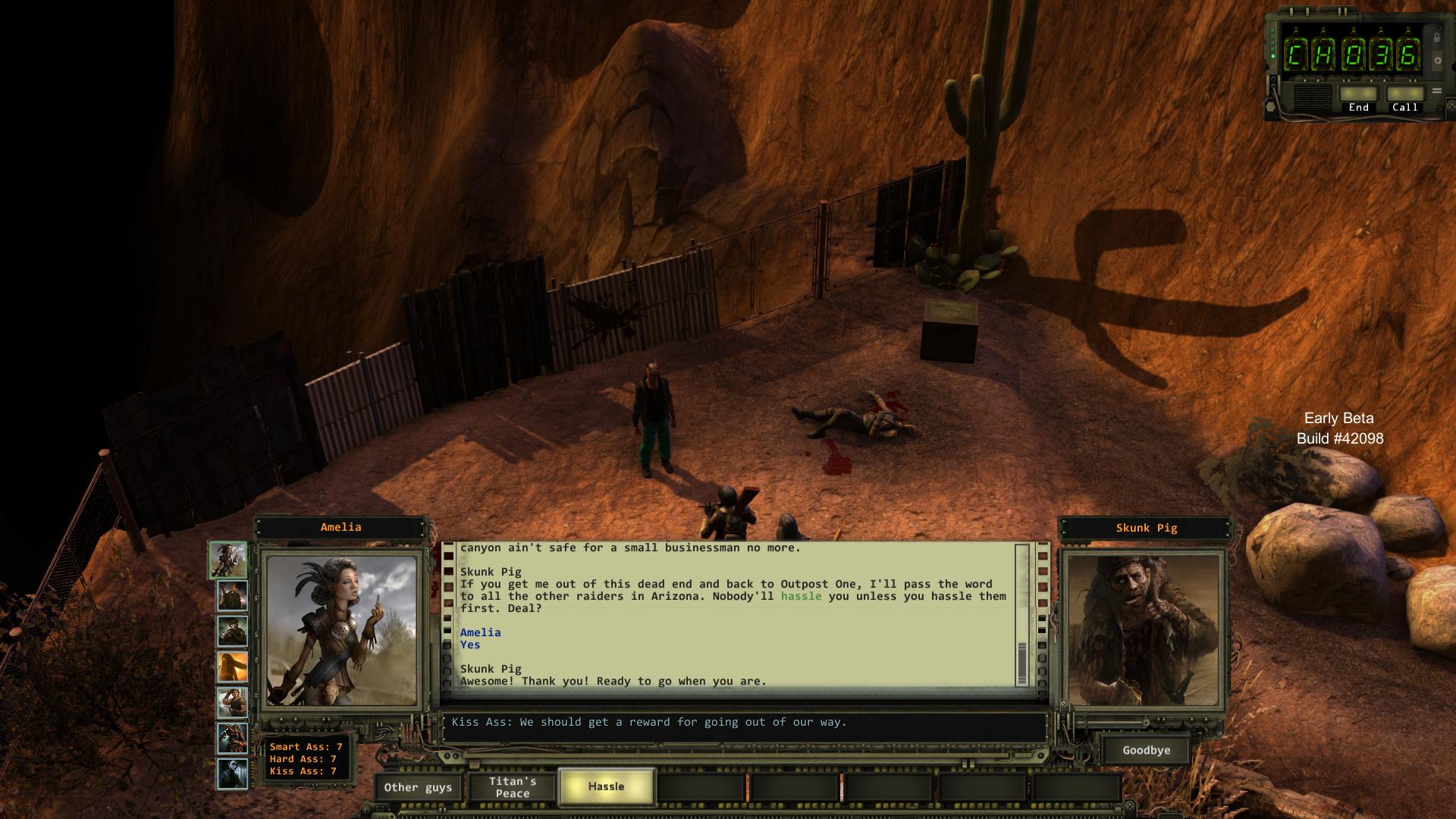 Auf der Route 66 begegnet euch am Wegesrand als nächstes Skunk Pig. Er war Anführer der Javelinas, einer Raidergruppe, die jetzt tot zu seinen Füssen liegt. Sie wurden von einer militärisch agierenden Gruppe aufgemischt. Skunk Pig hätte gerne eine Eskorte zum Außenposten eins. Die Aufgabe lohnt sich für euch aber nur, wenn ihr mit "Kiss Ass" Stufe 3 eine Belohnung (Medipak) einfordern könnt. Geleitet ihn die paar Meter zum Mad Monk Außenposten zurück und die Quest ist erfüllt.