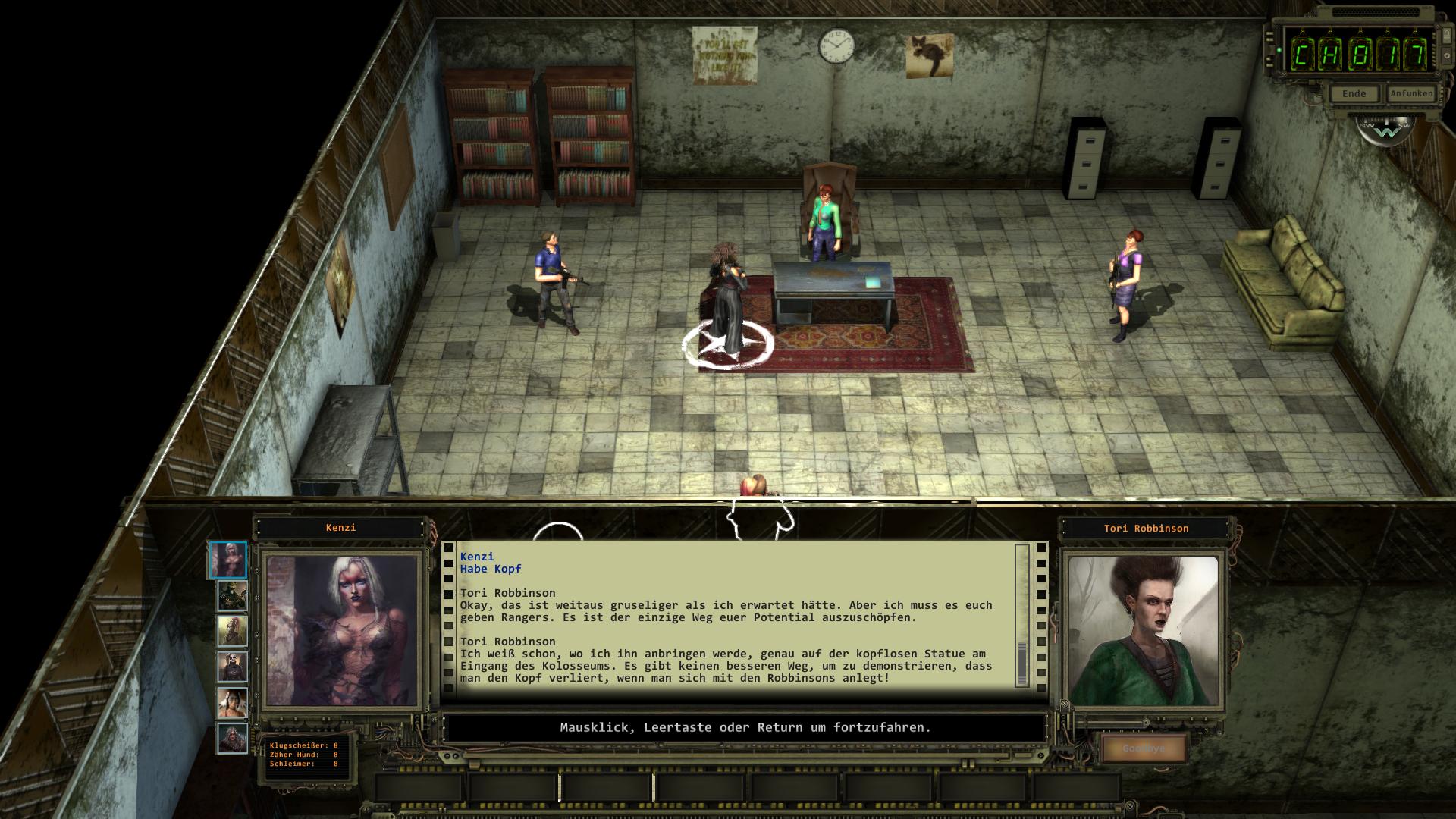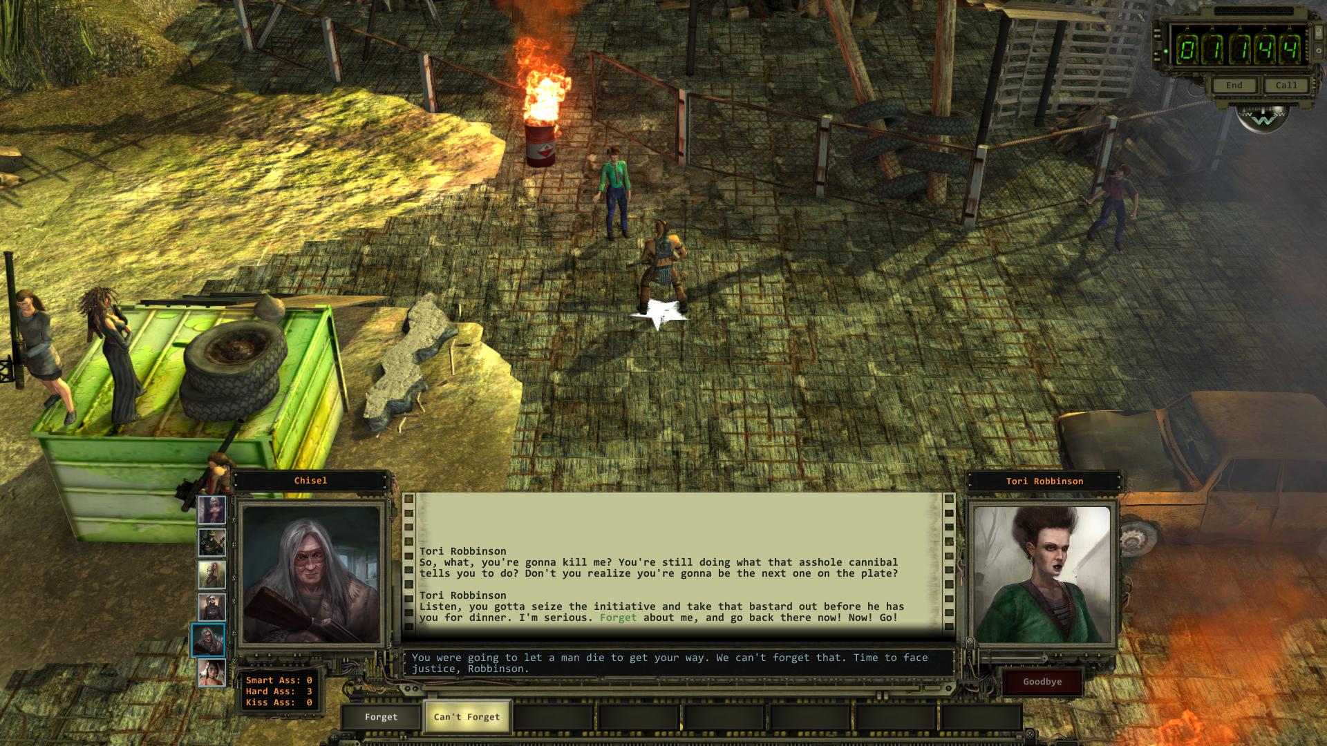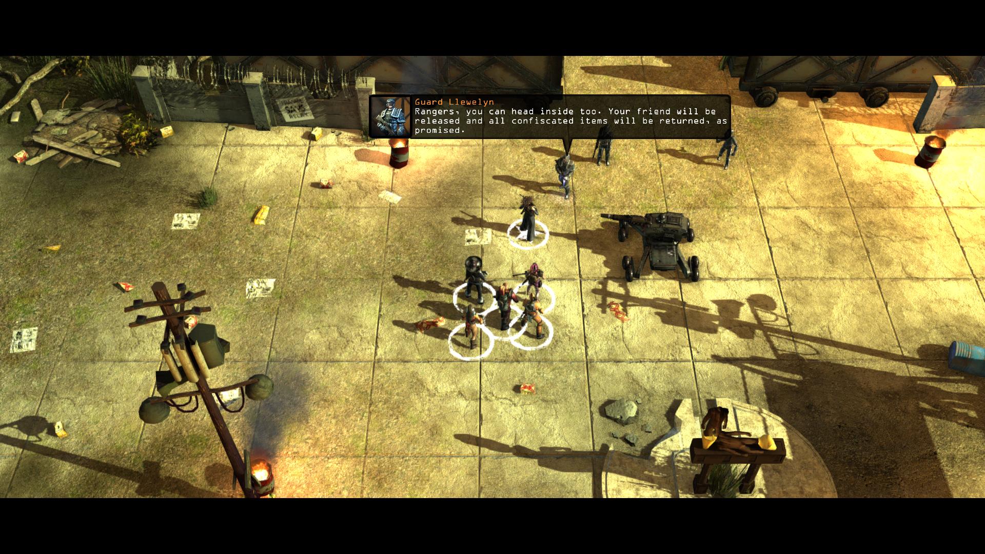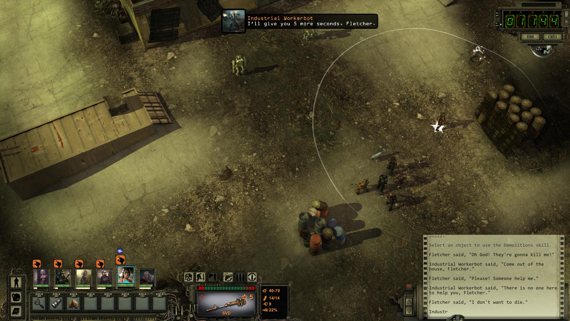 Wollt ihr Tori Robbinson an der Macht sehen, könnt ihr die gerade begonnen Nachforschungen weiter verfolgen. Geht zu Gene Crook am Wasserturm hinter Fletchers Zelle [12] und sagt ihm per Klugscheißer (Stufe 7), dass Roger Yee ihn und Nick bei Fletchers Entführung beobachtet hat. Daraufhin lenkt er ein und vermerkt Fletchers Versteck (Fetcher's Hideout) auf eurer Los Angeles Karte. Sucht das Versteck auf und lauft direkt in Richtung Haus. Vier Arbeiterbots (Workerbots) stürmen es gerade und wollen Fletcher erschießen. Seid ihr nicht schnell genug, gelingt ihnen das auch. Lauft auf Fernkampfdistanz heran und gebt einen Schuss auf einen der Roboter ab. Damit erlangt ihr einen kleinen Vorteil. Denn um das Haus ist ein Minenfeld. Falls ihr die Minen dank Wahrnehmung in eurem Umfeld sehen könnt, versucht die Arbeiterbots auf ihrem Weg zu euch hinein zu locken, damit sie bereits Schaden nehmen. Nach dem Kampf könnt ihr die verbleibenden Minen für zusätzliche Erfahrungspunkte entschärfen und Fletcher zurück zum Engel-Orakel (Angel Oracle) bringen.