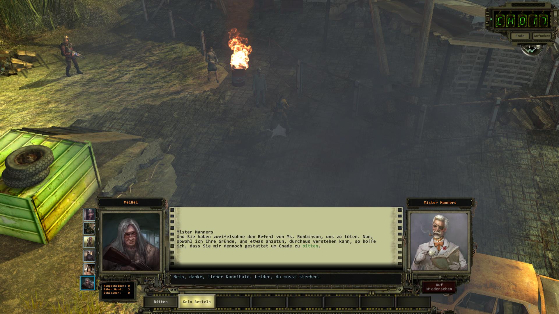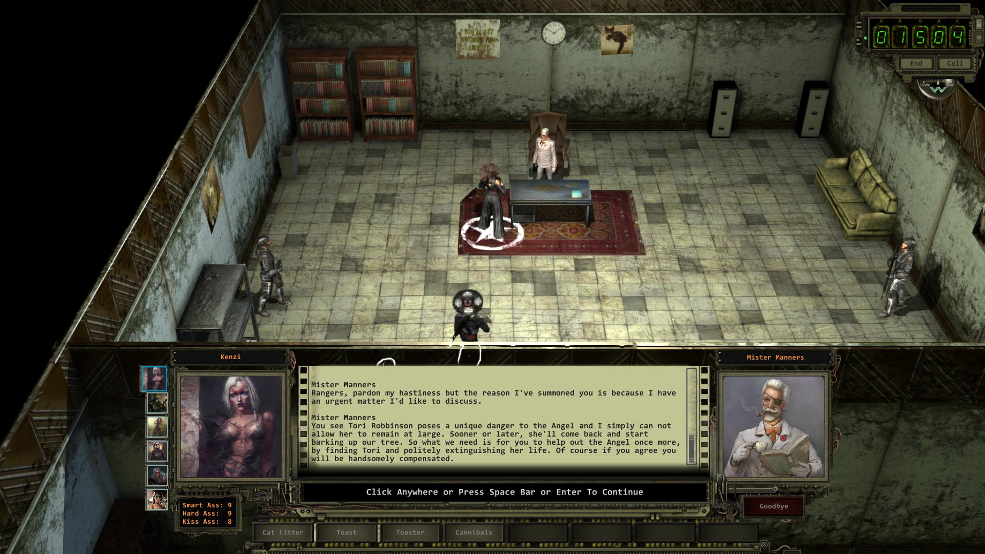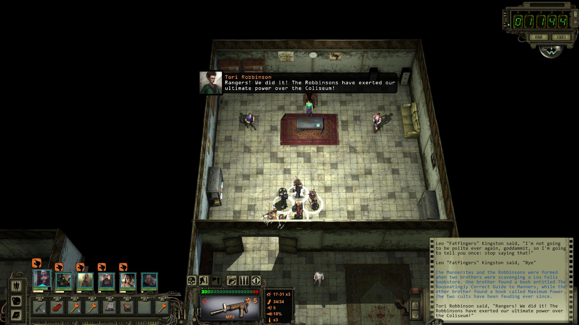 Von diesem Punkt an geht alles mehr oder weniger automatisch. Am Eingangstor von Engel-Orakel nimmt euch Wächter Llewelyn Fletcher ab und gibt euch euer normales Gruppenmitglied zurück. Danach könnt ihr Fletchers Hinrichtung durch zwei Kettensägen beiwohnen, euch Toris Enthüllung anhören und mit Ansehen, wie sie mit der Meute Jagd auf Mr. Manners macht. Im Anschluss an die Sequenz könnt ihr Tori in Mr. Manners altem Büro (Pressestelle) aufsuchen und euch die beiden Säcke Katzenstreu aus dem Regal nehmen. Tori bedankt sich für die Unterstützung und ihr könnt ihr erneut eure Hilfe anbieten. Woraufhin sie das Los Angeles Aquädukt als Mr. Manners Fluchtort auf eurer Karte verzeichnet. Ihr könnt nun eure Verstärkereinheit am Funkgerät von Engel-Orakel anbringen. Glen Goa ist in diesem Szenario feindlich und greift euch an, weil ihr laut ihm alles ruiniert habt. Aber er ist kein ernstzunehmender Gegner. In ganz Engel-Orakel herrscht nun Chaos. Sämtliche Wachleute sind verschwunden, die Felder abgebrannt, die Sonnenkollektoren zerstört und das Krankenhaus ist wegen Überfüllung geschlossen. Ihr könnt alle Safes und Kisten ungestört plündern. Im höhergelegenen Haus auf dem westlichen Außenring der Stadt findet ihr im dritten Tresor (der mit der niedrigen Herausforderungsstufe) die Ausrüstung eures kurzzeitig gefangengehaltenen Gruppenmitglieds. Die verbliebenen Manneriten sind in diesem Szenario feindlich und ihr könnt euch somit weder auf der Krankenstation versorgen lassen, noch einen der Toaster-Gegenstände eintauschen.