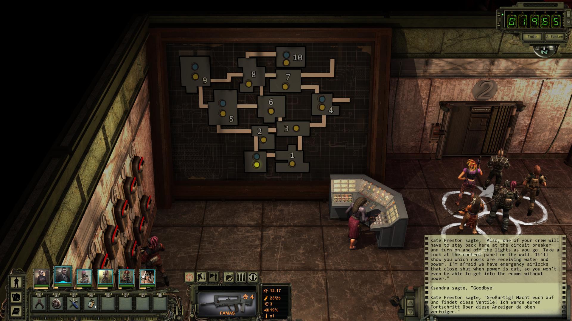 Legt euch an Hand der Karte neben den Schaltern einen Weg zu recht, um in allen Räumen vorbei zu kommen. Lediglich Raum Nummer eins ist uninteressant. Fangt den Weg bei Schleuse zwei an, da dort der Versorgungsraum ist und in ihm ein neues Ventil liegt, was ihr im ganz nordöstlichen Raum [10] benötigt. In den größeren Räumen werdet ihr meistens von Kakerlaken angegriffen, die jedoch wesentlich weniger drauf haben, als die "Abrisskolonne" (Wrecking Crew) Teams. Sucht die Abstellräume immer mit ab. In ihnen findet ihr Safes, Kisten und auch mal einen Toaster zum Reparieren. Achtet dabei jedoch stets aus Fallen! Im Klo [8] findet ihr zudem Scheiße für Leutnant Ming Lian Tian in der Ranger Zitadelle. Sobald ihr das eine Ventil montiert [10] und alle vier Ventile aufgedreht habt, könnt ihr zu Kontrollraum zurückkehren und dort ebenfalls das Ventil der Hauptsteuerung aufdrehen. Vergesst zudem nicht am Ende in Raum sechs die beiden Schalter für Strom (rechter Schalter) und Funk (linker Schalter) zu aktivieren. Womit diese Aufgabe ebenfalls erfüllt ist.