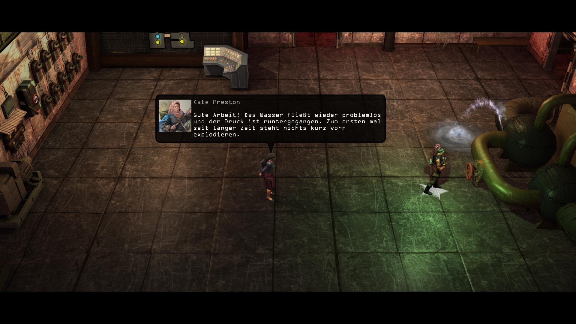 Im Hauptgebäude des Dorfes findet ihr Kate Preston [A], womit Seans Quest erledigt ist und mit Kates "Krisen" zwei neue beginnen. Abreißer haben eine Bombe über die Mauer geworfen, welche den Druckregler zerstört hat. Das Stromnetz und das Funkgerät wurden dabei ebenfalls zerstört. Aktuell benutzt Kate das "Reservesystem" um etwas Druck abzulassen. Das hilft aber nur bedingt. Eure Aufgabe besteht nun darin. zunächst die vier Entlastungsventile [4, 5, 9 und 10] aufzudrehen und dann das Umgehungsventil im Eingangsraum [A] aufdrehen.