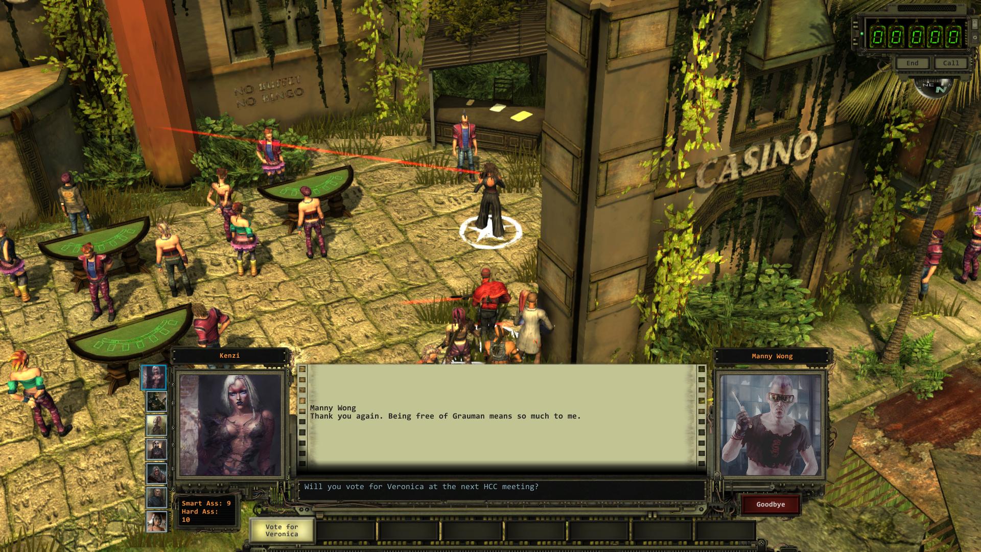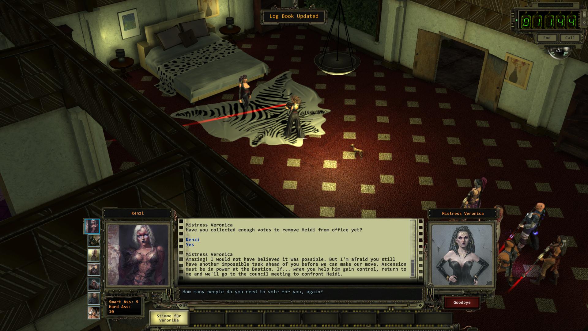 Habt ihr euch dazu entschlossen Veronica als neue Puffmutter einzusetzen, müsst ihr mindestens drei von vier Mitgliedern der fünfköpfigen Handelskammer - Heidi Hollander ist selbst ein Mitglied und kann logischerweise nicht überzeugt werden - dazu bringen gegen Heidi und für Veronica zu stimmen. Manny Wong solltet ihr jetzt in der Tasche haben. Durch den Fund der Poker-Chips und die Erpressungsfotos braucht ihr Manny [7] nur auf seine Stimme ansprechen und er ist auf eurer Seite. Da Flo die neue Chefin von Swags Drugstore [14] ist, ist euch ihre Stimme ebenfalls gewiss. Stimme drei und vier könnt ihr euch von Rambeau [16] und Martha und George (High Ground) [12] abholen.