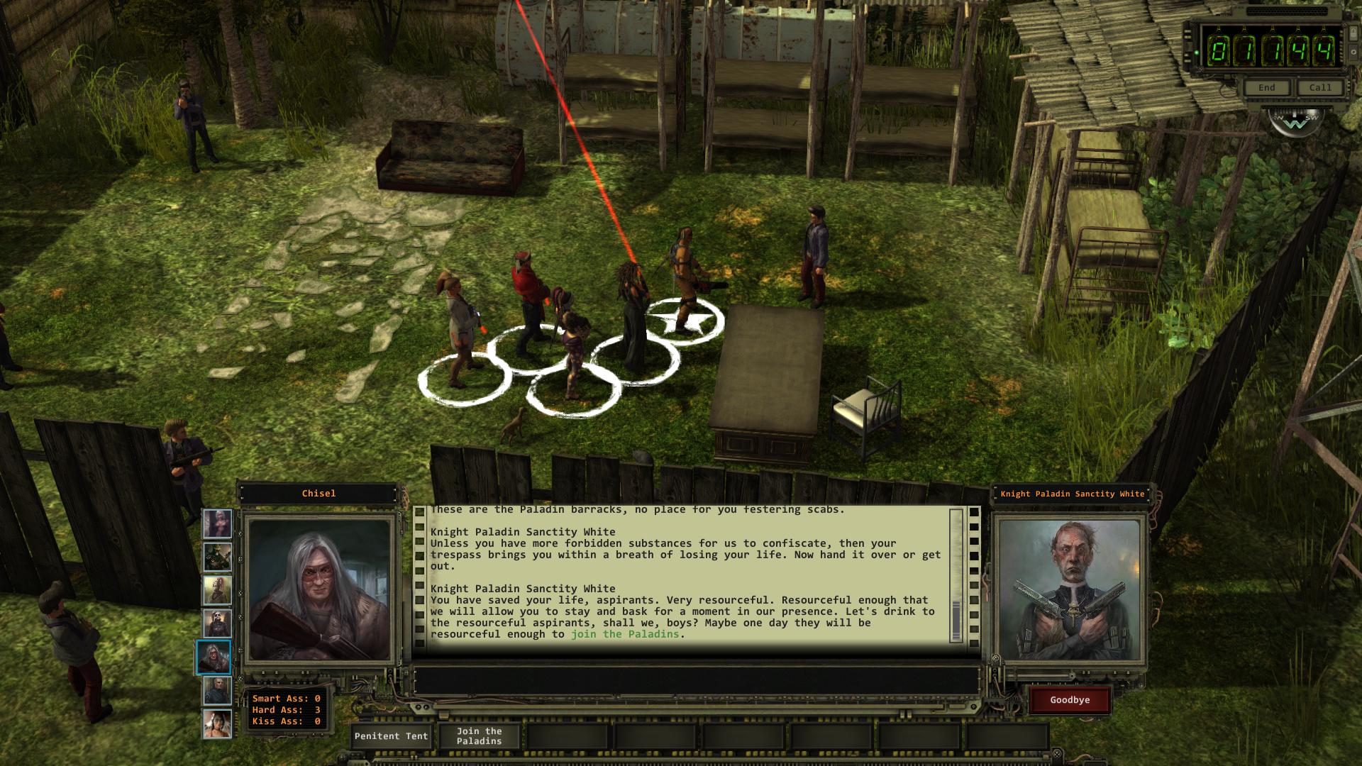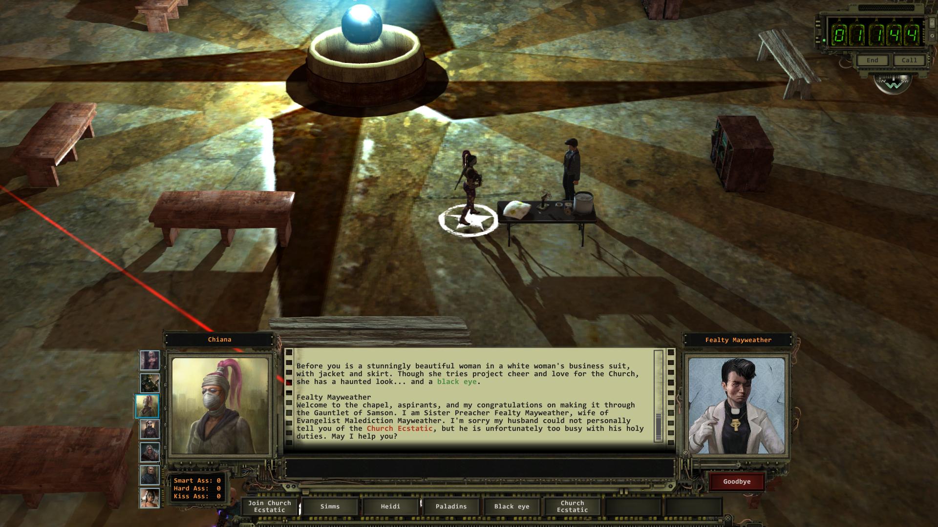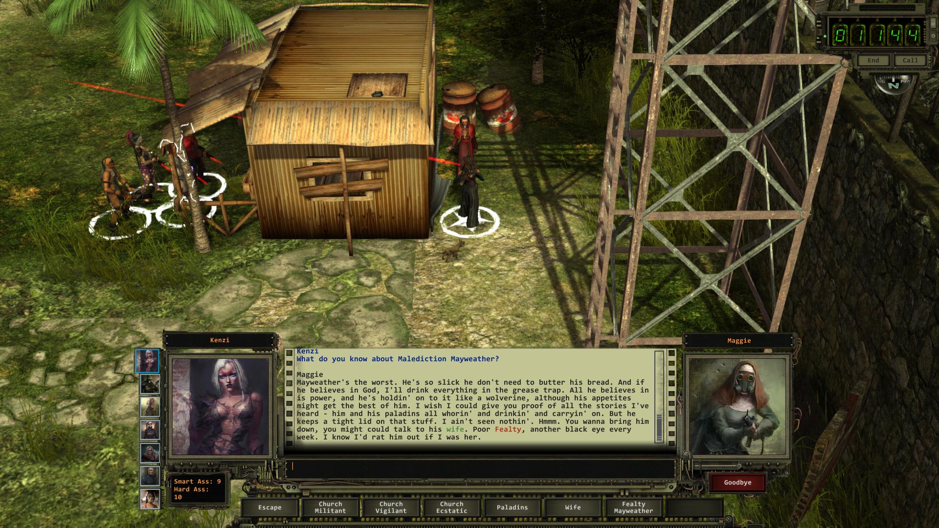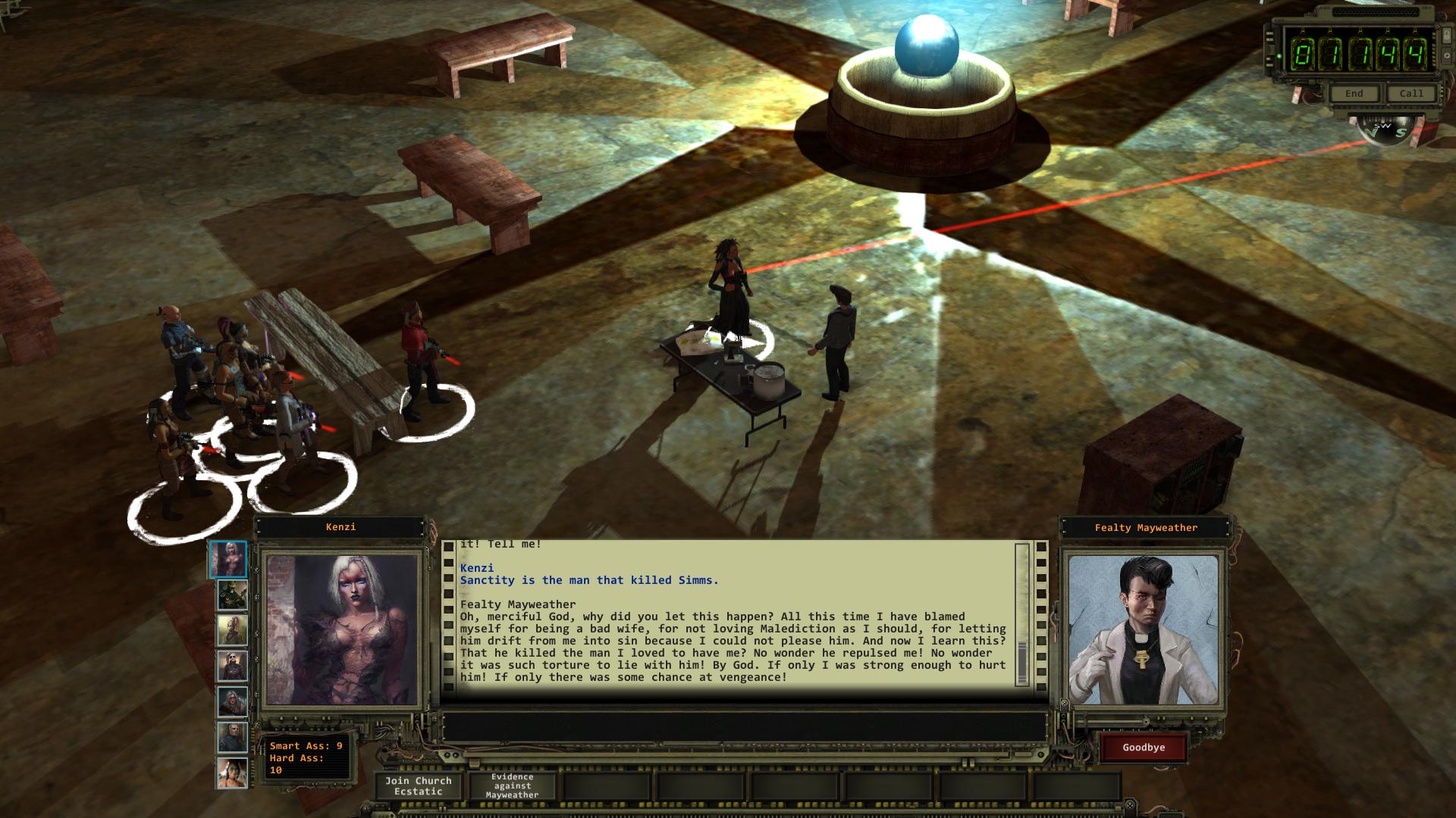 Mit Malediction Mayweathers Frau Fealty [7] könnt ihr euch ein wenig unterhalten, ohne der Kirche beizutreten. In dem Gespräch könnt ihr sie u.a. auf ihr blaues Auge und den Ringabdruck darin (erfordert Klugscheißer Stufe 8) ansprechen. Sie blockt das an der Stelle ab. Aber ihr merkt bereits, dass da etwas nicht stimmt. Sprecht ihr Fealty Mayweather auf die verlangten Beweise an, sagt sie, sie hätte keine Kraft mehr zu kämpfen. Geht nach dieser Sackgasse nach draußen auf den Hof und unterhaltet euch dort mit Maggie.