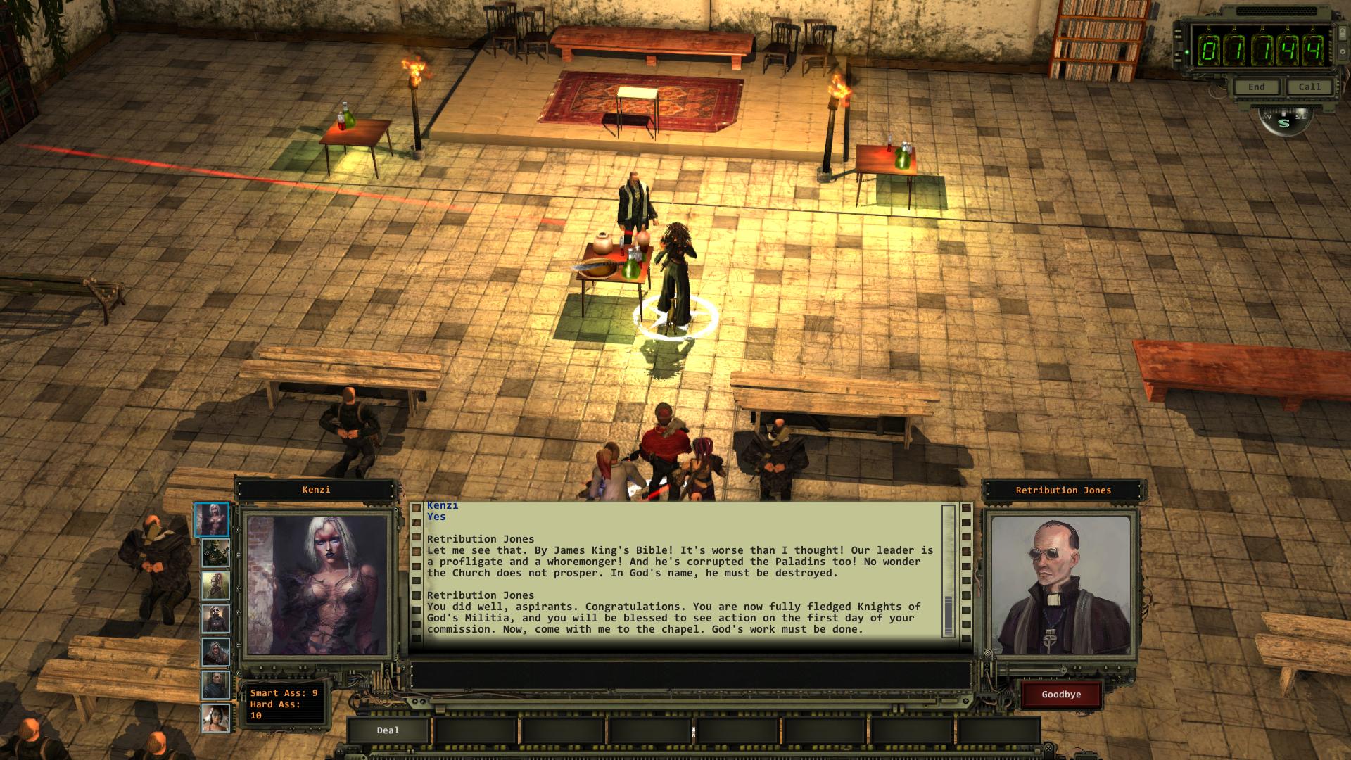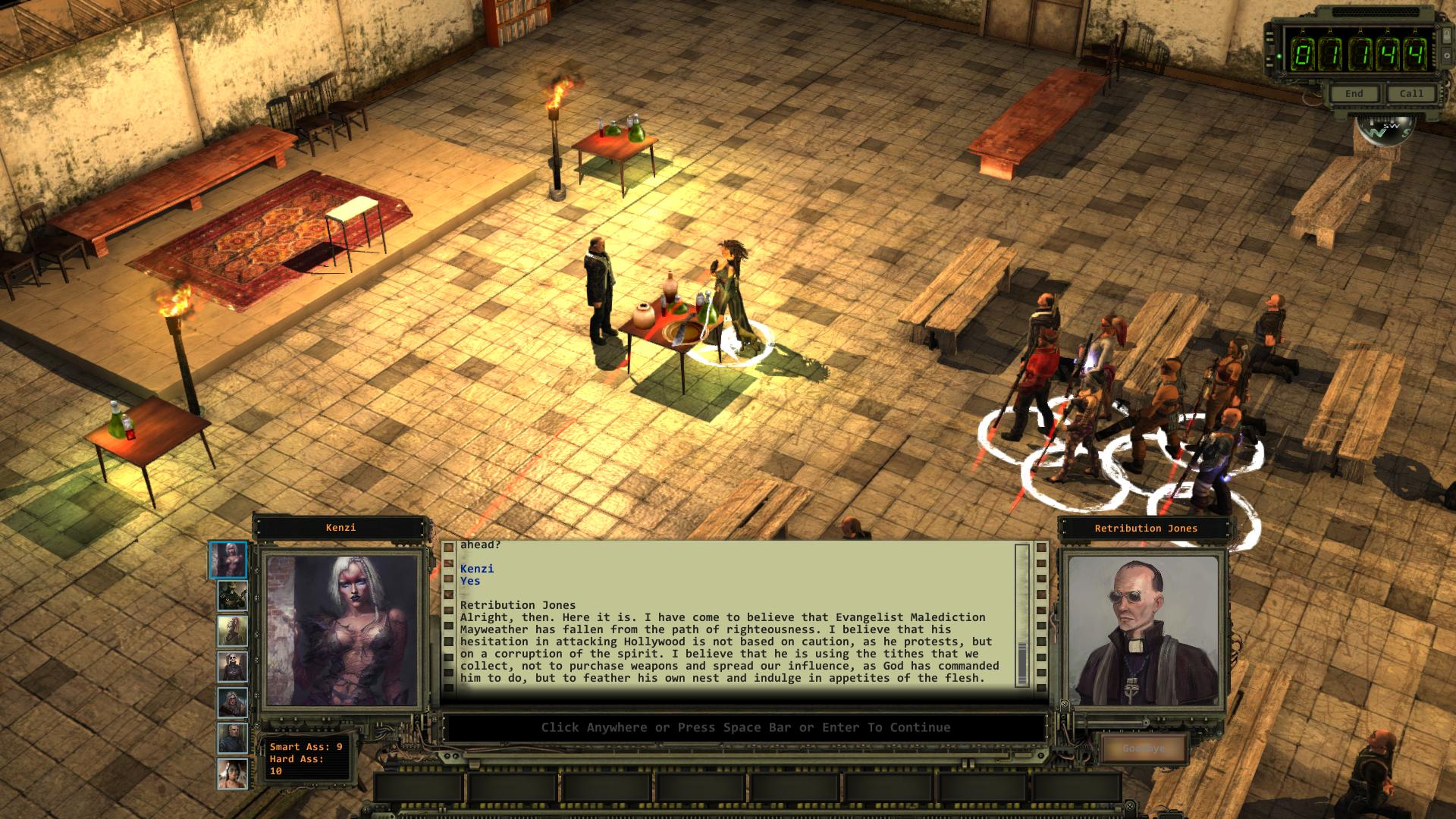 Retribution Jones [6] erzählt euch von McDades eigentlichem Auftrag. Er sollte Hollywood unterwandern und von innen heraus zu zerstören - so ist er wohl in Heidis Hollywood Hideaway gelandet. Aber McDade macht effektiv Garnichts. Deshalb hält Jones nichts von den anderen. Er meint die Kirche bräuchte mehr Soldaten und nicht mehr Prediger. Tretet ihr seinen Kirchenstreitern (Church Militant) bei, fordert Retribution Jones Beweise, die Malediction Mayweather belasten, damit er selbst neues Oberhaupt werden kann. Er glaubt Malediction sei vom Pfad abgekommen und vermutet keine Vorsicht hinter dem ausbleibenden Angriff auf Hollywood, sondern eine Verderbung Maledictions Geistes.