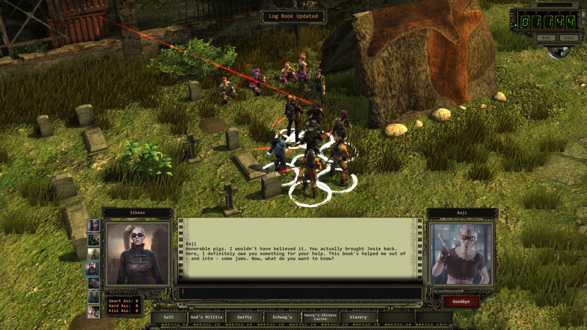 In der Kanalisation gibt es neben dem Lagerraum [6] aber noch eine interessante Sache zu erledigen. Nahe dem Hotel California Eingang [1] ist ein Lager mit Salz Junkies. Hier liegt Josie im Sterben. Mit Chirurg (Herausforderungsstufe 10) könnt ihr sie retten. Ist euch das gelungen, bittet sie euch sie zu Raji zu bringen. Das ist der Sprecher der Peoples Republic of Hollywood auf dem Friedhof, welcher euch als Schweine bezeichnet hat. Bringt ihr Josie jedoch zu ihm zurück, ändert das seine Einstellung euch gegenüber komplett und er schenkt euch das Schlösser knacken Fertigkeitenbuch: Entfesselungskünstlertum für Arschlöcher (Escape Artistery for Assholes).