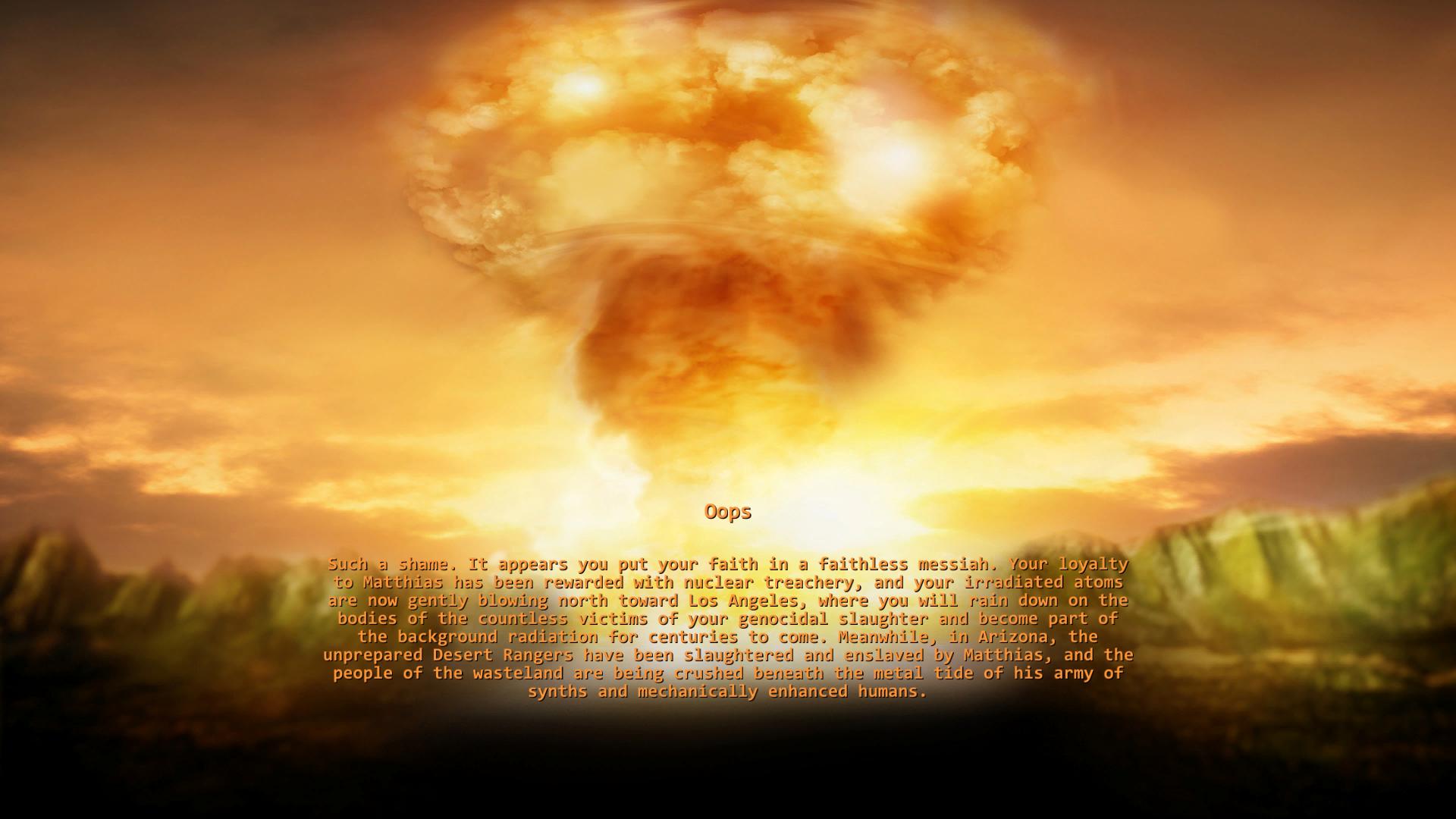 Mit Erfüllung der vierten Aufgabe, klappt ein Geheimfach am Computer-Terminal auf. Aus dem ihr die Ultimativen Strahlenschutzanzüge (Stufe 6) entnehmen und mit denen nach Seal Beach durchgehen könnt. In dieser Version ist Seal Beach leicht verändert. Statt Mad-Money Mike und aggressiven Syntheten, steht am Eingang ein weiteres Computer-Terminal, über das ihr euch mit Matthias unterhalten könnt. Matthias bescheinigt euch darüber wie unglaublich loyal und dumm ihr doch seid! Er würde euch doch nie zurück mit nach Arizona nehmen. Wenige Sekunden darauf sprengt er Seal Beach mit einer Atombombe in die Luft und das Spiel ist für euch zu gelaufen!