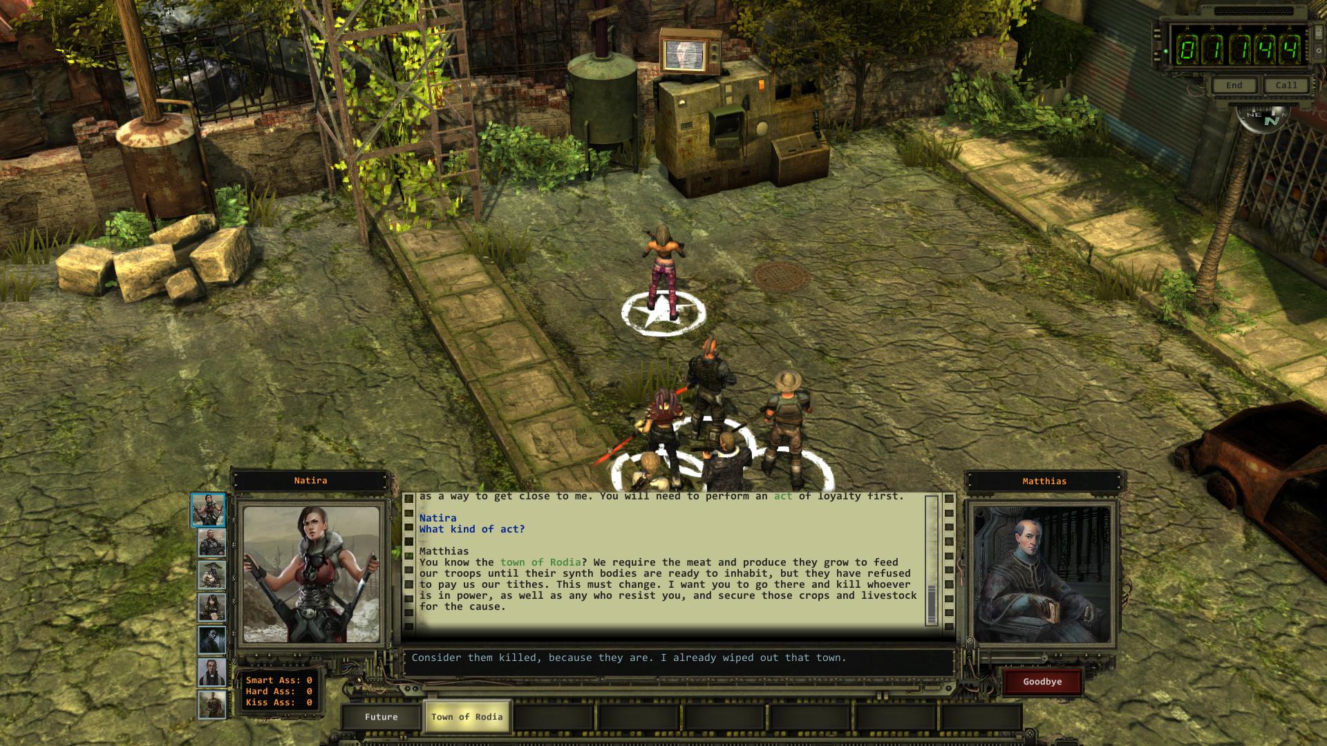 1. Auftrag: Rodia. Matthias benötigt das Fleisch der Opossums von Rodia für seine eigenen Truppen und möchte, dass ihr die Bewohner dazu bringt, es ihm zu überlassen. Effektiv entspricht das der Chris Van Graas Lösung. Ihr müsst also dessen Vater, den Bürgermeister, töten, damit die Aufgabe erfüllt ist.