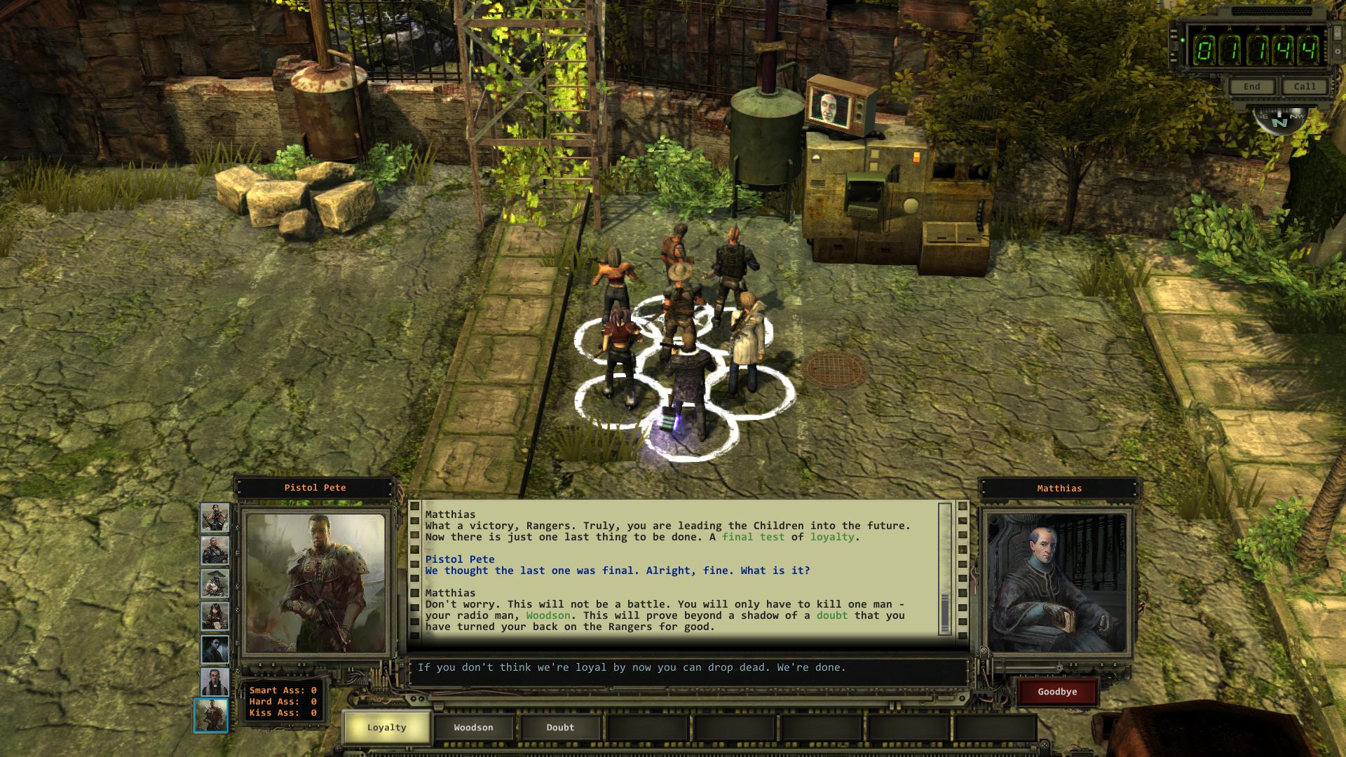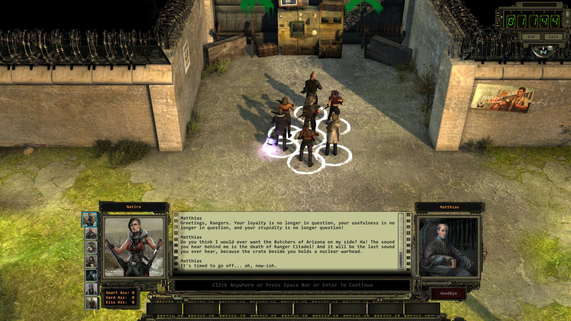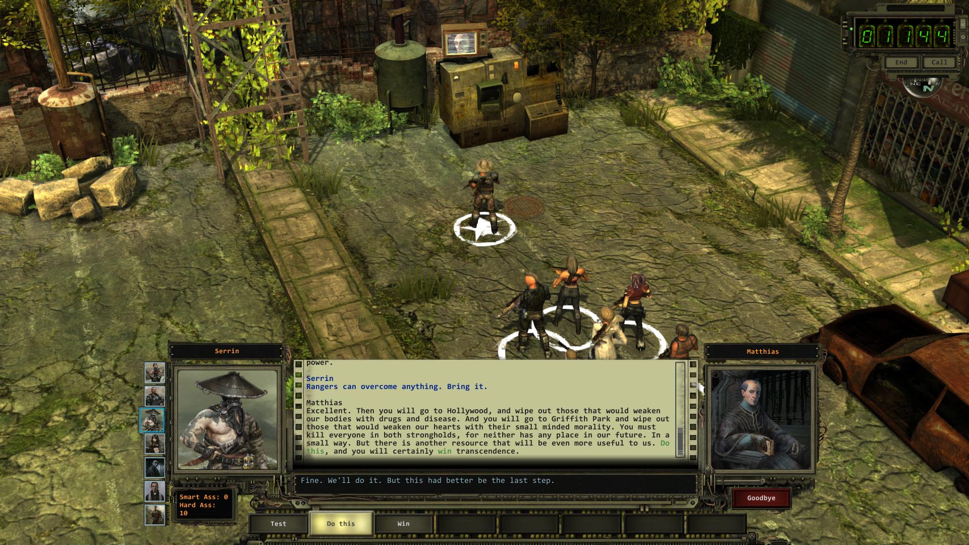 Am nordöstlichen Ende von Hollywood, gleich neben dem Geheimgang in die Bastion, steht ein Computer-Terminal [5], über den Matthias euch von seiner goldenen Zukunft erzählen und zum Mitmachen überreden möchte. Effektiv könnt ihr durch das Gespräch Matthias entlocken, dass er einen Angriff auf die Ranger-Zitadelle in Arizona plant und dadurch General Vargas warnen. Während der Unterhaltung habt ihr nach jedem Überredungsversuch von Matthias zwei oder drei Antwortmöglichkeiten, von denen die meisten auf Ablehnung und das Ende des Gesprächs hinauslaufen. Durch die letzte verbleibende Antwort, könnt ihr aber auch so Sachen sagen wie "Ich hätte nie gedacht, dass ich das sage, aber ich schließe mich dir an.". Was dazu führt das euch Matthias eine Reihe von Aufträgen gibt, mit denen ihr eure Loyalität ihm gegenüber unter Beweis stellen könnt.