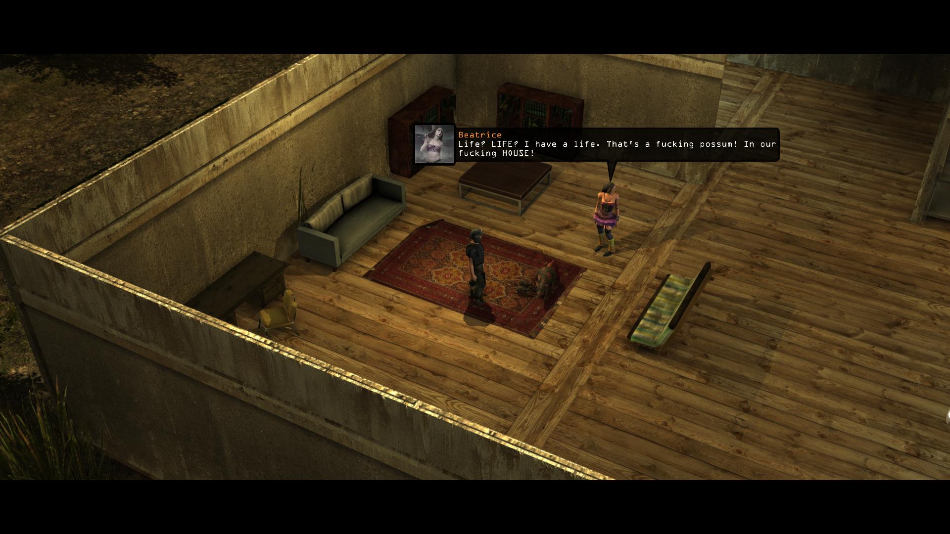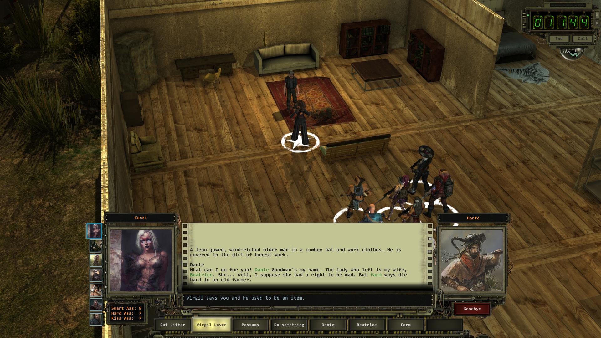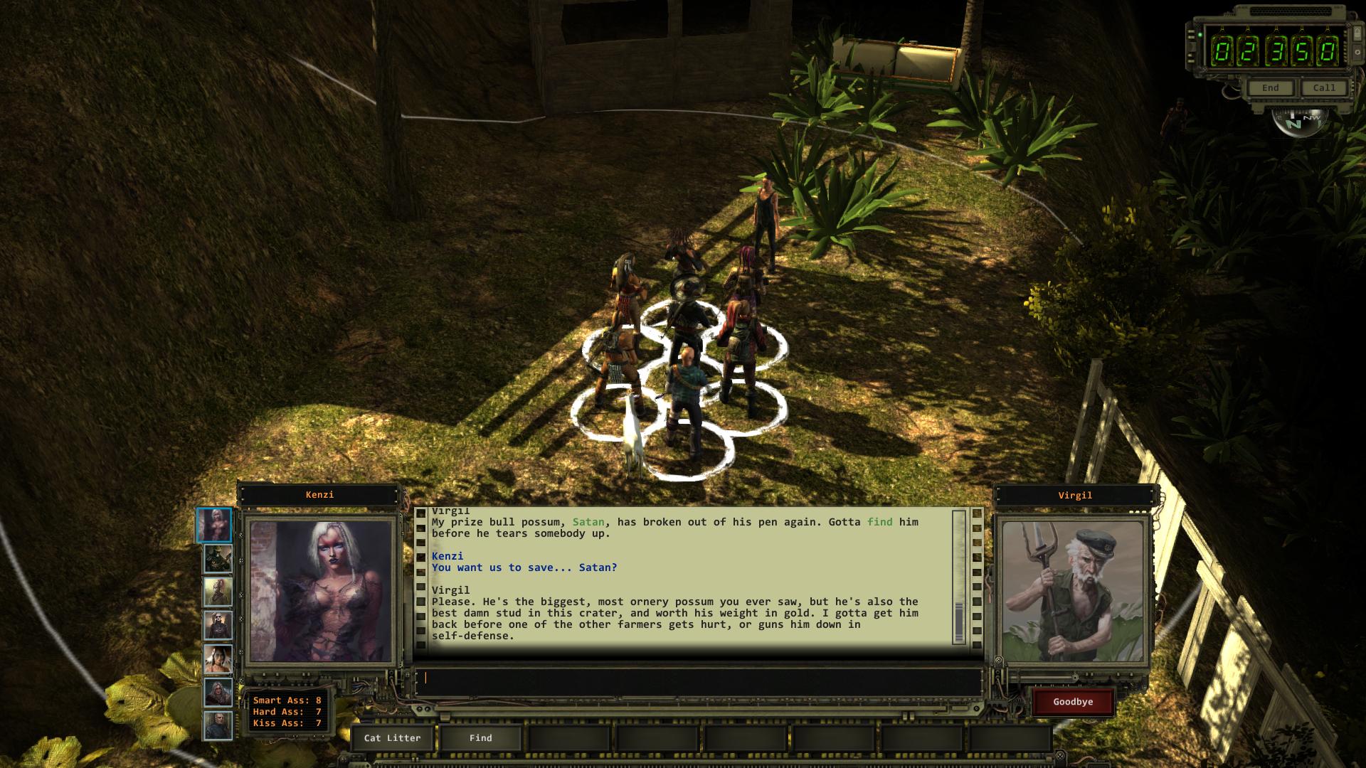 Virgil [13] ist auf der Suche nach Satan. Sein preisgekröntes Opossum ist ihm entlaufen und er will es wieder haben. Satan sitzt unweit von Virgils Hof im Krater [15]. Ihr braucht das schwarzrote Biest lediglich mit den von Virgil erhaltenen Opossum Snacks (Possum Snacks) locken und schon folgt es euch zurück zu Virgil. Anschließend könnt ihr Virgil auf das Funkgerät ansprechen. Woraufhin er zugibt, das mit Absicht funktionsunfähig gemacht zu haben. Reparieren will er es aber erst wieder, wenn ihr ihm den Gefallen tut, seinen ehemaligen besten Freund Dante Goodwin vor der Goldgräberin Beatrice zu retten.