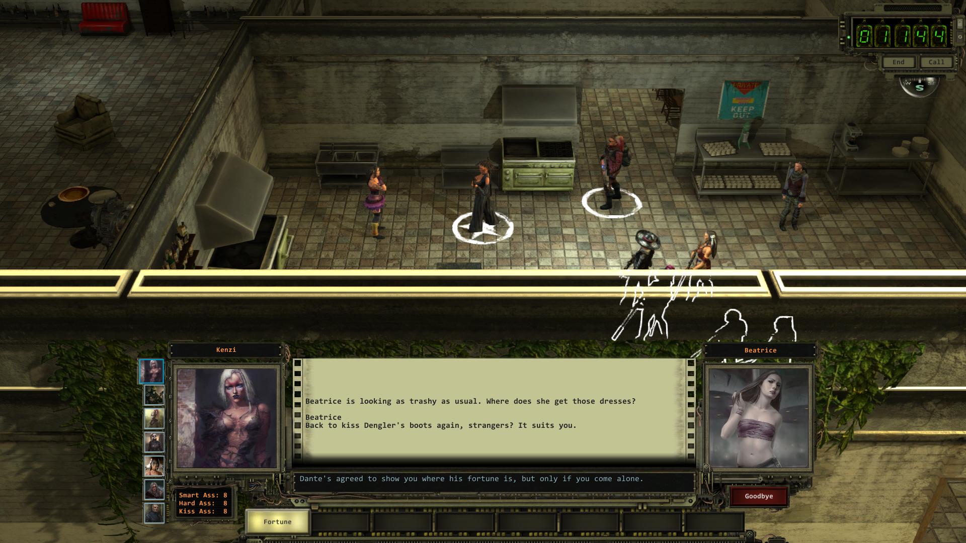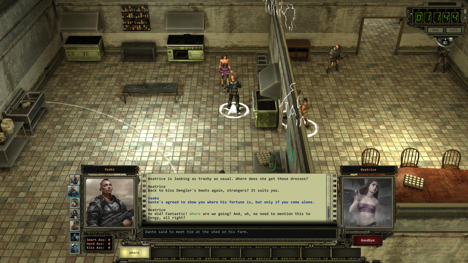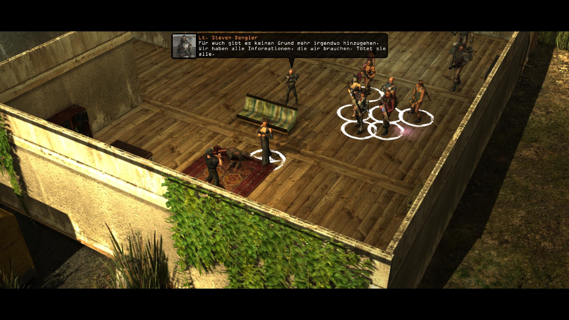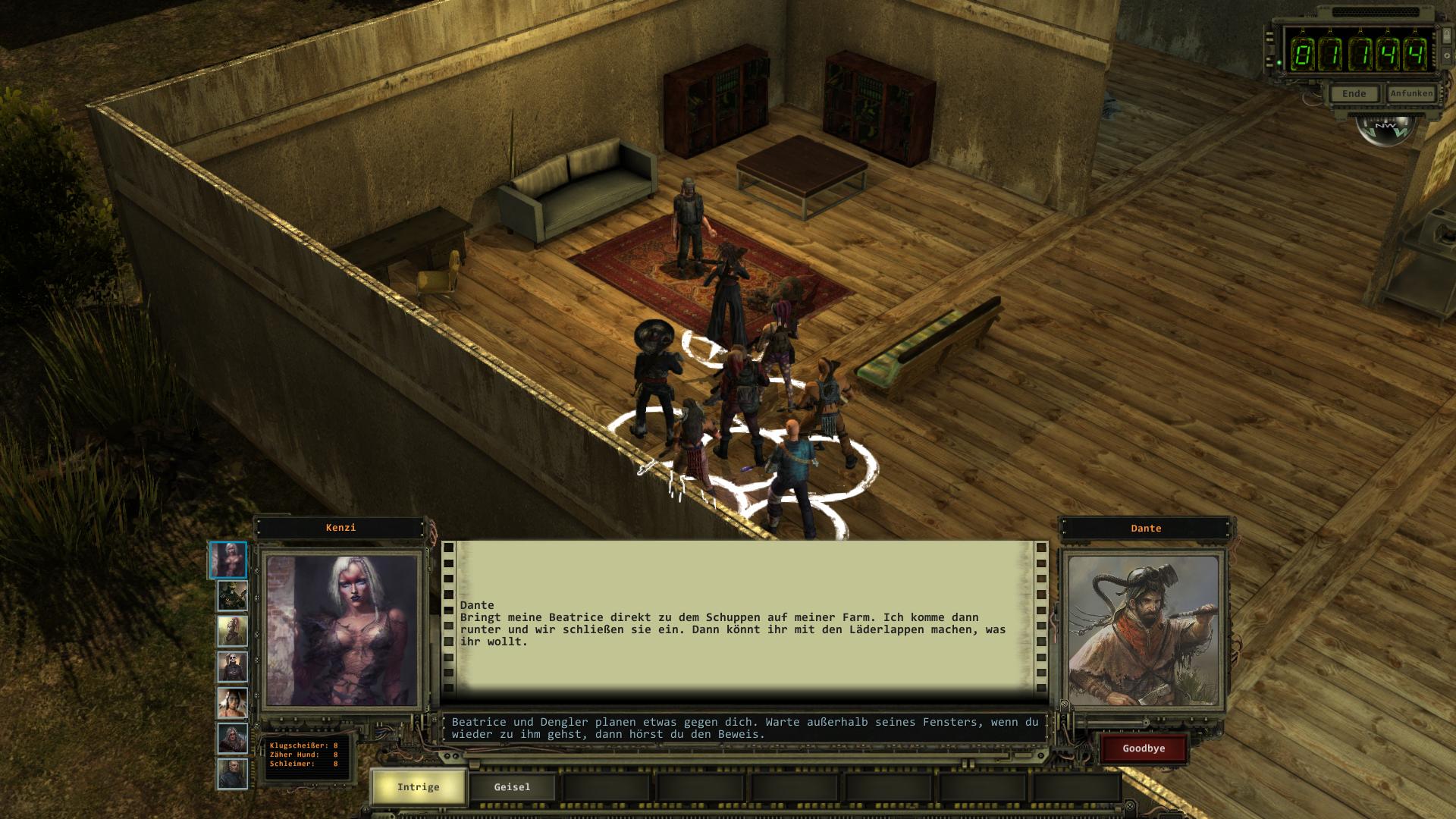 Begebt euch als nächstes zu Denglers Haus [5] und sagt den Wachen am Eingang, dass ihr Arbeit sucht. Geht durch in Denglers Büro und redet mit ihm. Auf die Frage, ob ihr sein handeln für falsch oder nicht falsch haltet, müsst ihr an dieser Stelle mit nicht falsch antworten. Dann hält er euch für einen Pragmaten und bietet euch für Macht oder Geld Aufträge an. Ihr dürft diesen Schritt nicht machen, wenn ihr Pistole Pete in der Gruppe habt. Denn er würde sofort aussteigen und wäre für immer weg.