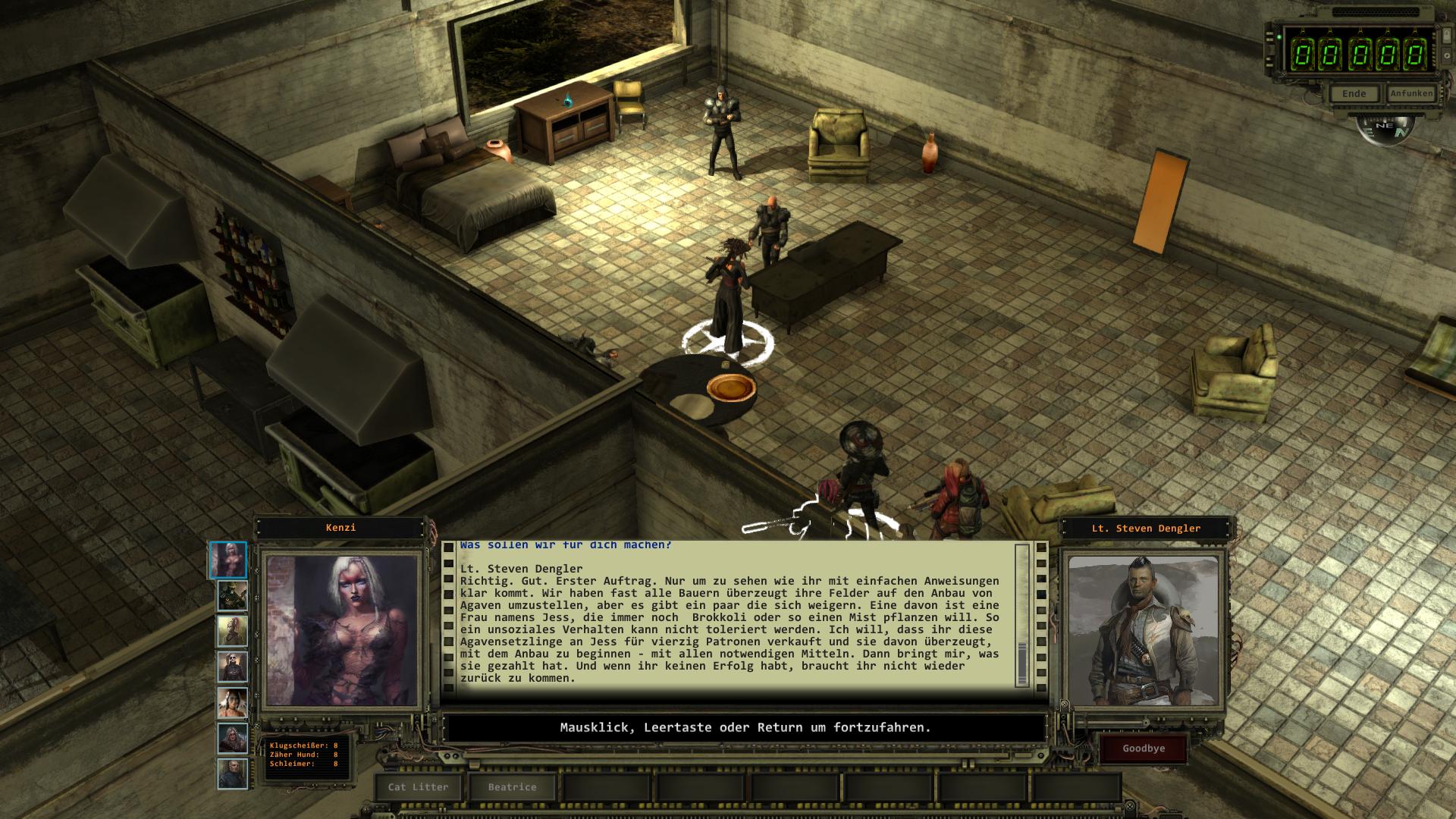 Der erste Auftrag besteht im Agaven-Anbau. Die Läderlappen haben fasst alle Bauern überzeugt, deren Anbau auf Agaven umzustellen, aber ein paar weigern sich. Jess [12] baut partout Brokkoli an. Dengler gibt euch Agaven Ableger und will, dass ihr sie für 40 Patronen an Jess verkauft und sie diese anbaut.