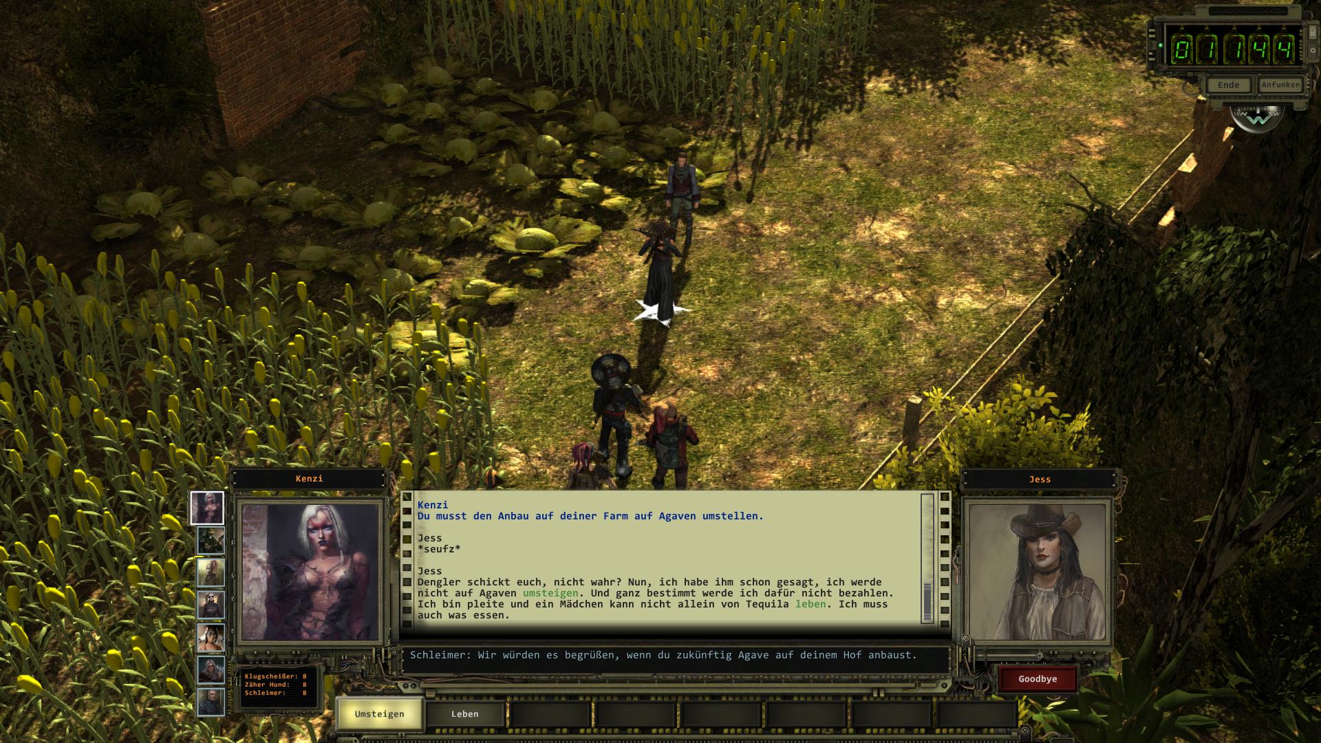 Jess [12] könnt ihr anschließend drohen "Wenn du leben willst, baust du die Agaven an" oder bei ihr schleimen (Stufe 6) "wir würden es begrüßen, wenn du die anbaust". Das herumsäuseln bringt aber nichts. Sie würde eher sterben, weil sie die letzte Bäuerin ist, die noch Nahrung anbaut und die Bewohner damit versorgt. Ihr könnt vorschlagen die 40 Kugeln selbst zu bezahlen. Wofür Jess euch äußerst dankbar ist und ihr eine gerechte Lösung gefunden habt. Greift ihr stattdessen richtig hart durch und droht Jess damit sie umzubringen, zahlt sie euch die 40 Kugeln, wird aber bei der erstbesten Gelegenheit die Stadt verlassen.
