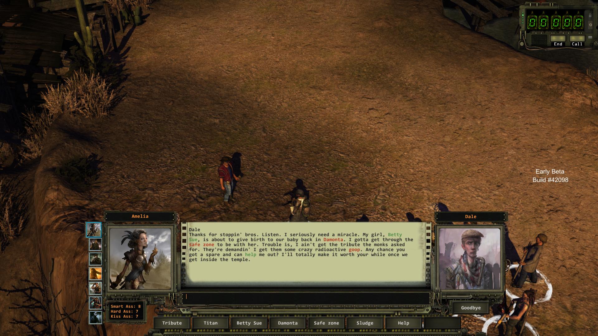 Kurz vor dem eigentlichen Eingang zum Tempel stoßt ihr am Wegesrand auf Dale. Angeblich liegt seine Frau Betty in den Wehnen und deshalb will er sofort zu ihr nach Damonta. Er kann aber nicht durch die Safe Zone, weil die Mönche von ihm ebenfalls "Radioactive Goop" haben wollen. Ihr könnt ihm einen eurer bereits gefüllten Kanister geben und erhaltet dafür einen leeren von Dale. An für sich ist die Situation aber etwas komisch. Die Mönche verlangen von normalen Leuten eigentlich keine derartigen Tribute. Befragt ihr Dale etwas genauer, verstrickt er sich immer weiter in Lügen. Er wechselt den Namen seiner Frau zu Betty Lou. Was eine "Kiss Ass" (Stufe 2) Frage aufwirft (Du hast deine Frau zuvor nicht Betty Lou genannt). Darauf meint er, dass seine Frau zwei Schwestern hat (Betty Mae, Betty Sue und letztlich Betty Lou). Was eine weitere "Kiss Ass" (Stufe 2) Antwort aufwirft: Jetzt ist es Bertha Lou. Sprecht ihr Dale erneut an, nennt er seine Frau Amy Sue... Es stellt sich also die Frage, ob Dale die Arbeit wert ist. Wie dem auch sei, könnt ihr die Radioaktive Schlacke relativ schnell ersetzen. Denn östlich von Dale, noch vor dem Eingang zum Titan-Tempel, sind zwei Raider-Gruppen und die nordöstliche hat hinter einem einschlagbaren Zaun ein weiteres Fass.